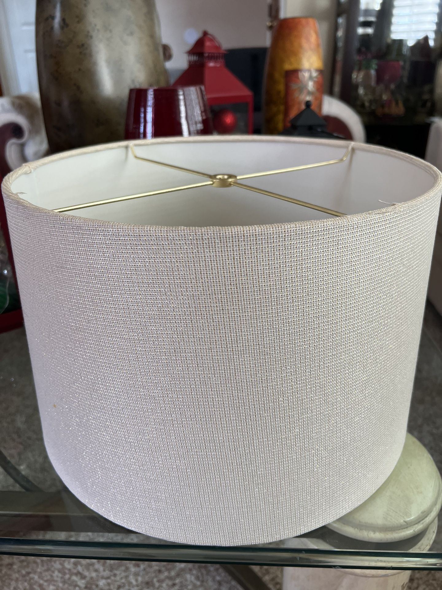 For sale is a slightly used barrel/drum style shade. Height measures 9.5”. Top diameter measures 14”. Bottom diameter measures 15” so it flares out a bit. Tan color. Finial not included.