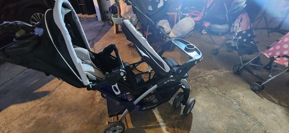 Grey and Black sit and stand stroller in good condition. The back seat is removeable.