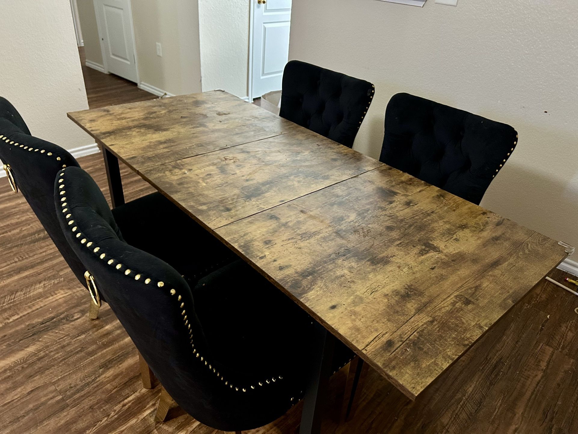 2 black velvet tufted chairs with gold legs and accessories / Matching Table with black legs