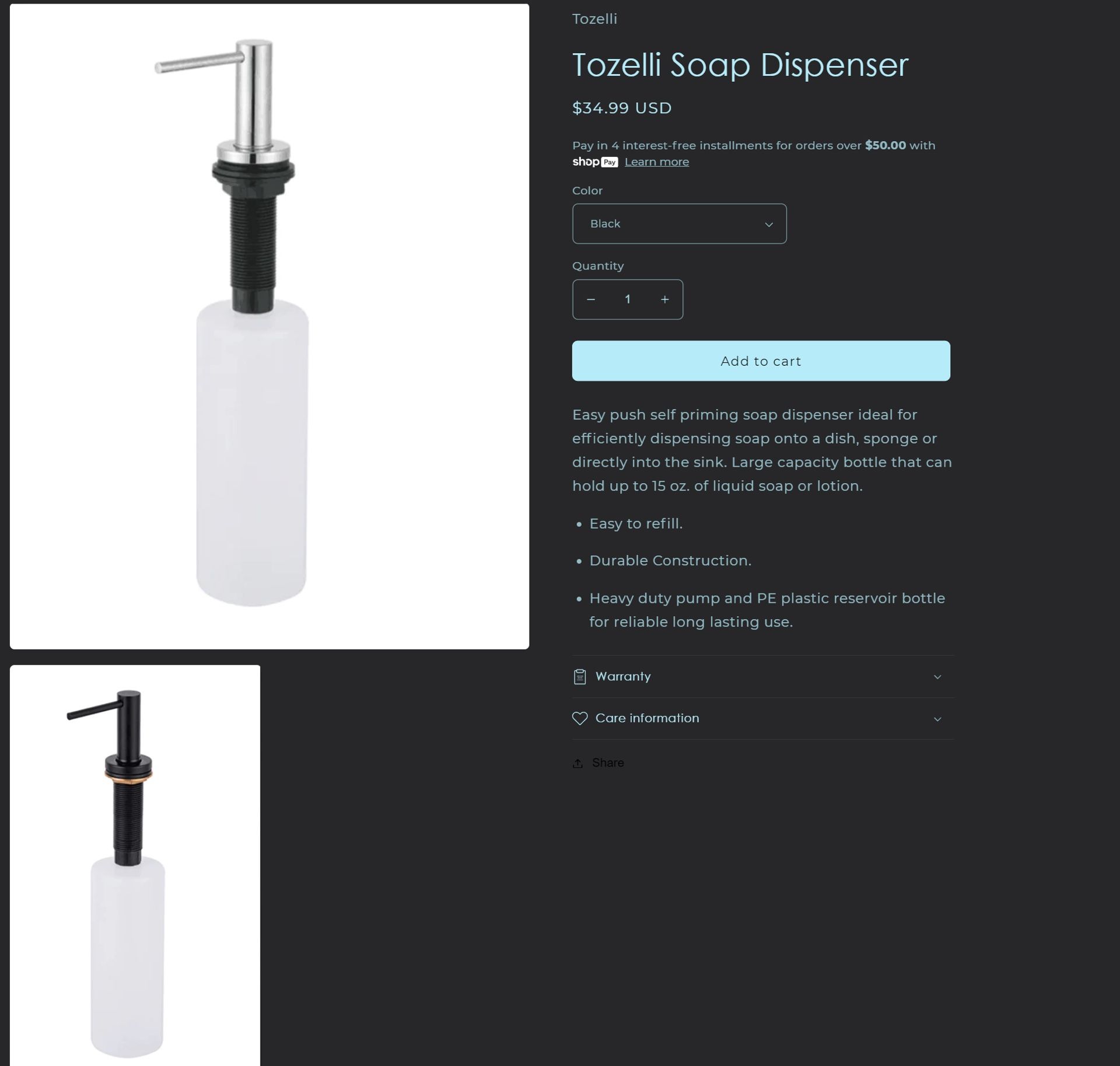 Easy push self priming soap dispenser ideal for efficiently dispensing soap onto a dish, sponge or directly into the sink. Large capacity bottle that can hold up to 15 oz. of liquid soap or lotion. Easy to refill. Durable Construction. Heavy duty pump and PE plastic reservoir bottle for reliable long lasting use. 10 year warranty
