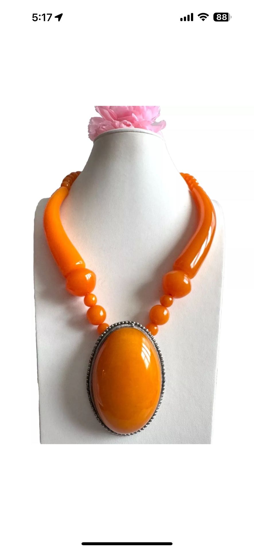 This vintage style pendant necklace is a one-of-a-kind piece featuring unique design and beautiful orange amber resin beads. The pendant is also made of amber resin and length is 22-inch and weighs stunning 159 grams. The necklace is from himalayan region Nepal and showcases craftsmanship that is both intricate and admirable. The necklace is perfect for those who appreciate unique jewelry pieces and want to make a statement with their style. The beaded style and amber resin material create a vintage feel that is perfect for any occasion. Don't miss out on this opportunity to add a special piece to your jewelry collection.Thanks and happy shopping 🙏