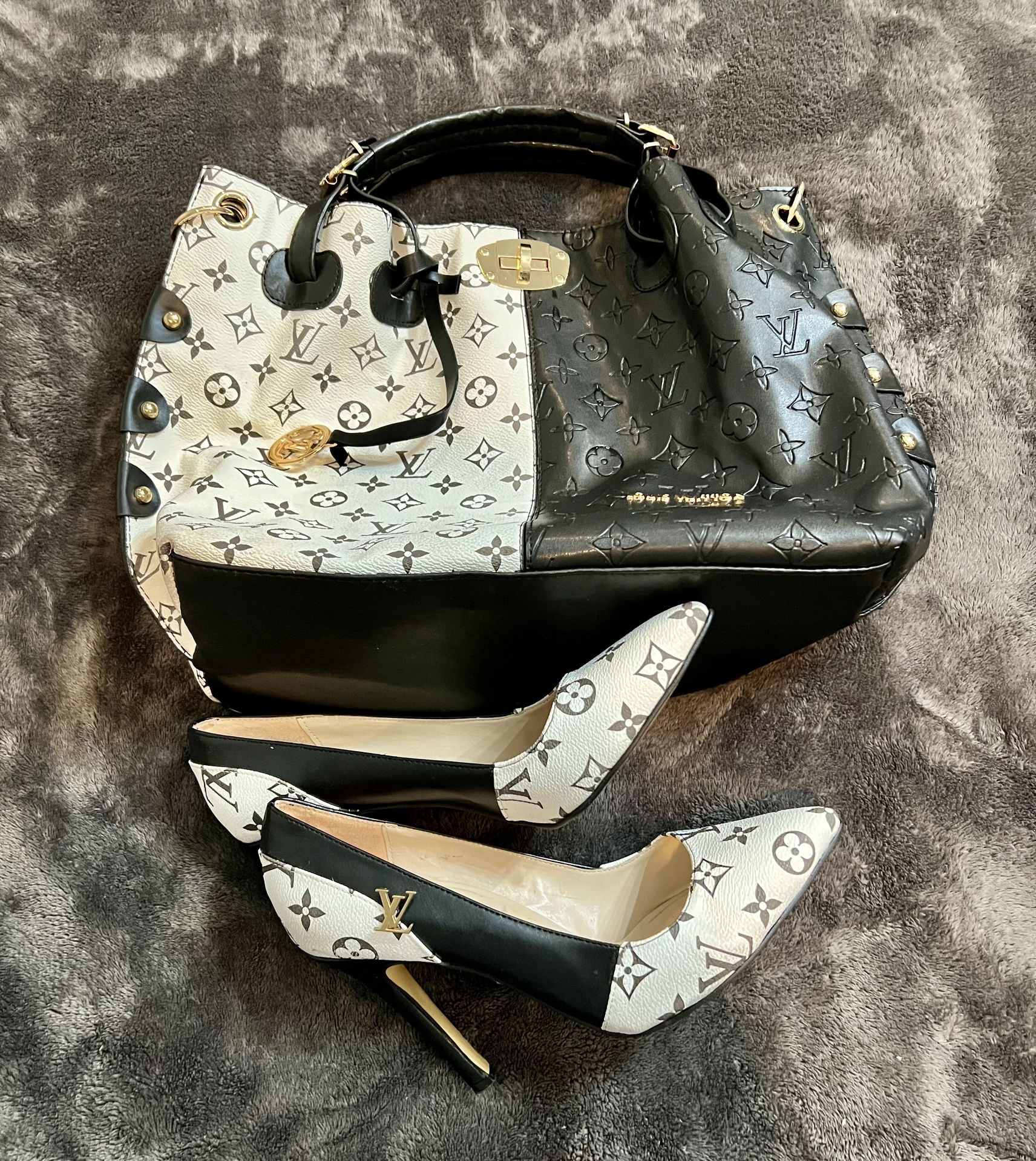 Super cute black and white handbag and heels set. Purse is large. Shoes size 9.5.