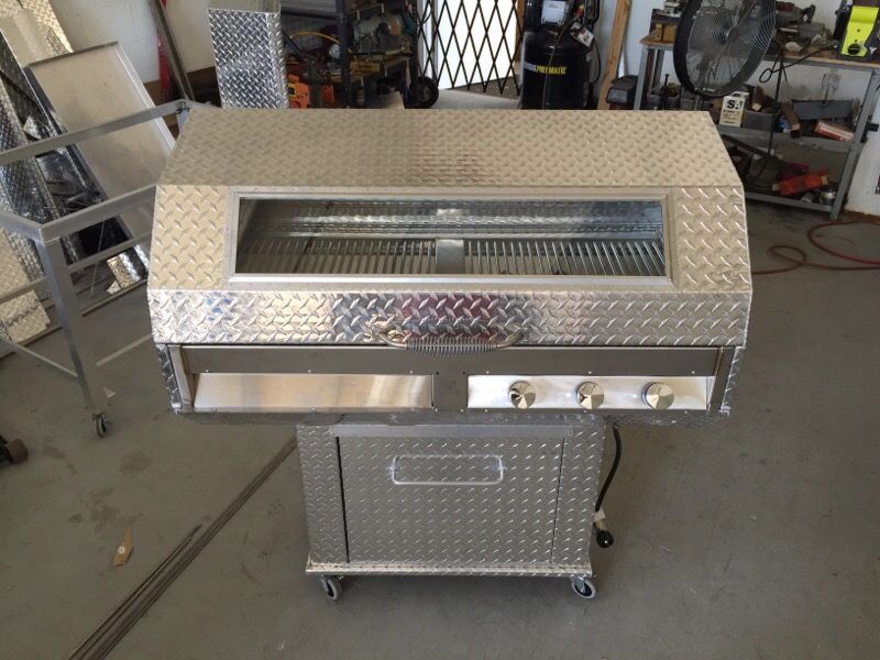 J&F Customs, diamond plate BBQ grill with stainless steel insides (Inc. burners/ cooking grates) This is the ultimate grill, light weight tempered glass and lighting to keep an eye on your cooking. Allows cooking options with charcoal and/or propane gas burners and is 100% custom made to your liking. Made with quality & durability to last a lifetime, over 20 years in the grilling industry! Give us a call for all of your grilling needs! Instagram: @JFcustomgrills J&F Customs ofrece los mejores hornos/BBQ. Hechos todo a mano de material liviano, diamond plate y stainless steel (cristal templado para tener vista a lo que cocina). Ofrecemos opciones de gas or carbón y combinación de los dos como el que ves en esta foto. Le podemos agregar cualquier opcion/es a su gusto. Hecho con calidad y durabilidad. Tenemos más de 20 años de experiencia. ¡Contáctenos hoy para hacerle el horno que usted desea!