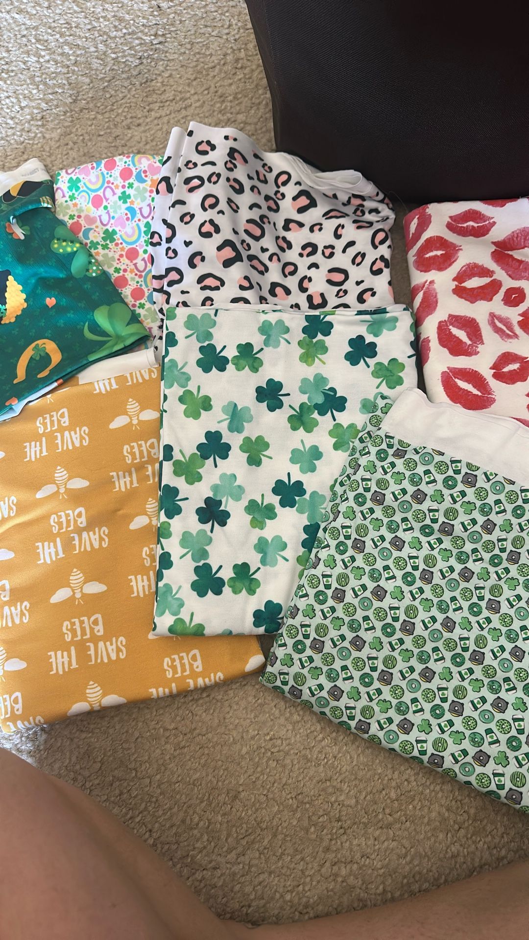 Lucky charms- cotton, 1 yard Kisses- cotton spandex jersey, 1 yard Clovers- jersey, 1 yard Rainbows and pot of gold- cotton spandex jersey, 1 yard Horseshoe, pot of gold- modern jersey, fat quarter Cheetah- modern jersey, fat quarter Coffee and donuts- modern jersey, 1 yard Save the bees- modern jersey. 1 yard
