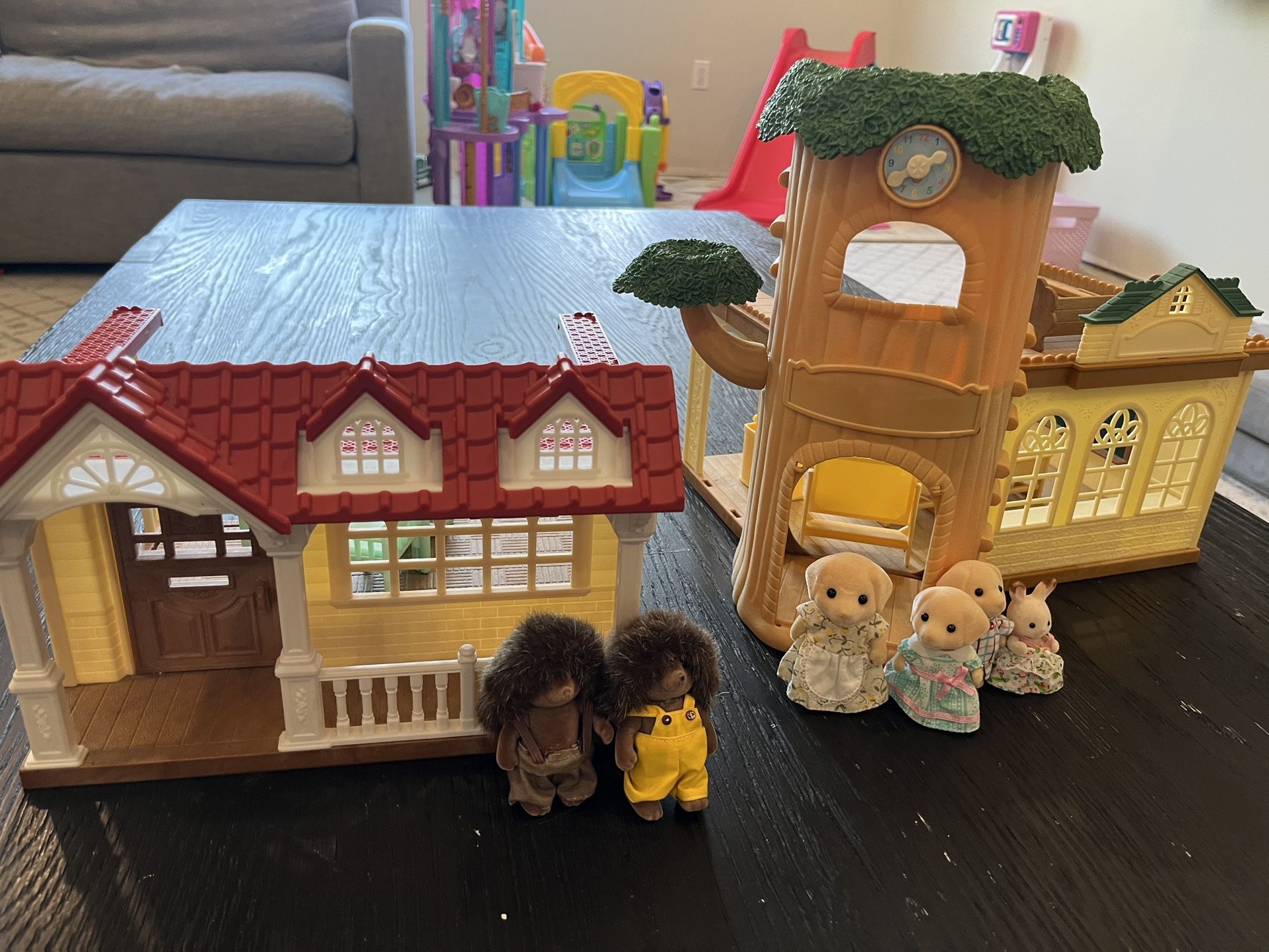 6 calico critters (see photo), the red house with bunk bed and the tree house school house. All pieces in the photo included.