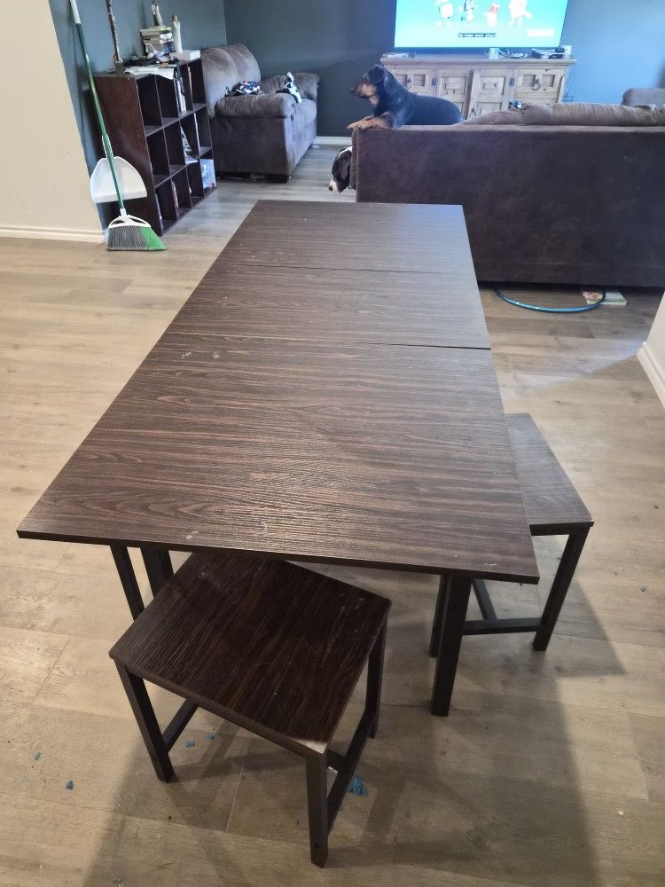 Table with leaf and 6 matching stools. Used good condition. Pick up in Ennis