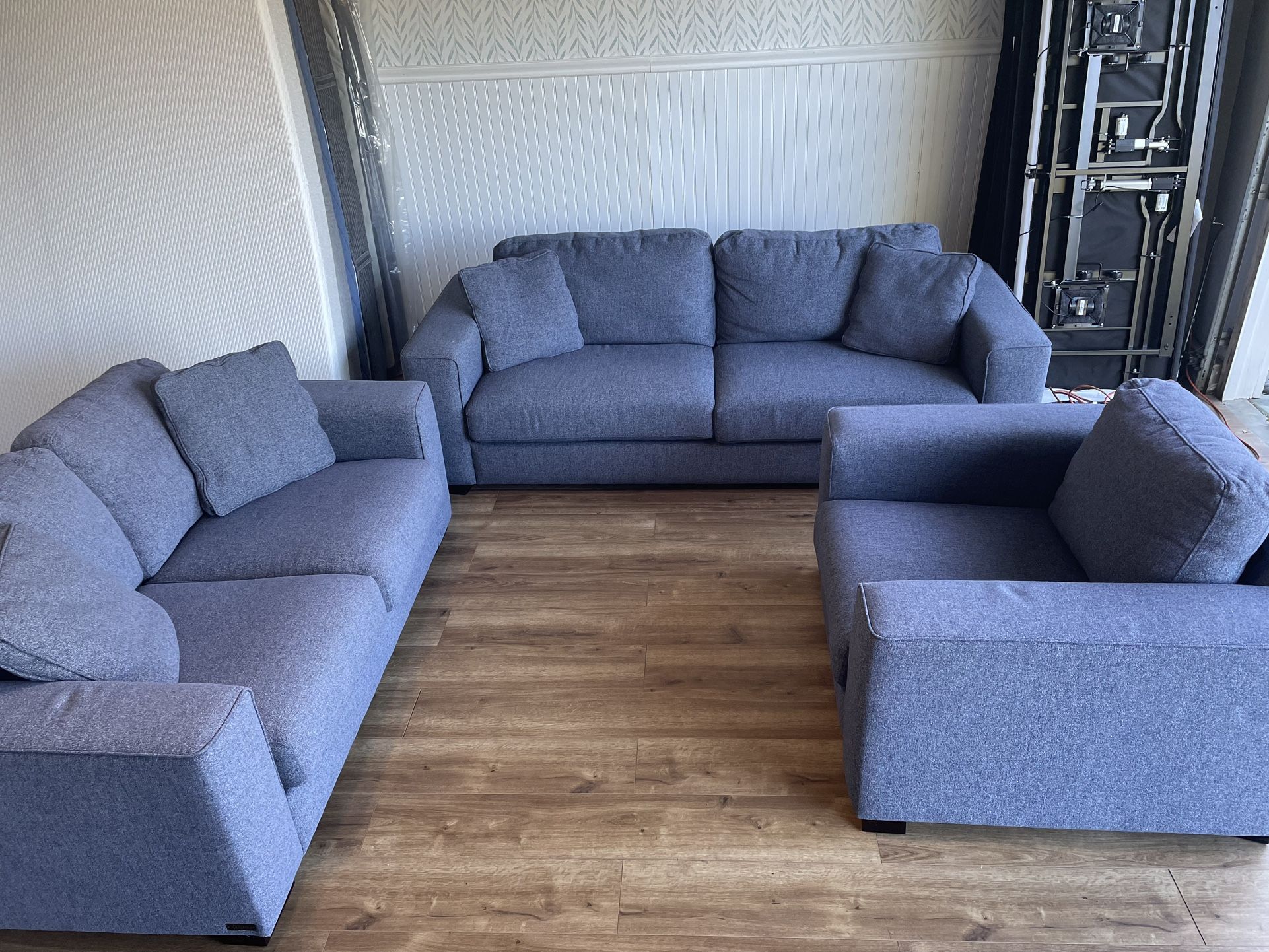 Abbyson brand Couch, loveseat and ottoman. Great condition. No rips or tears. Beautiful and high quality. Originally was $3200 plus tax.
