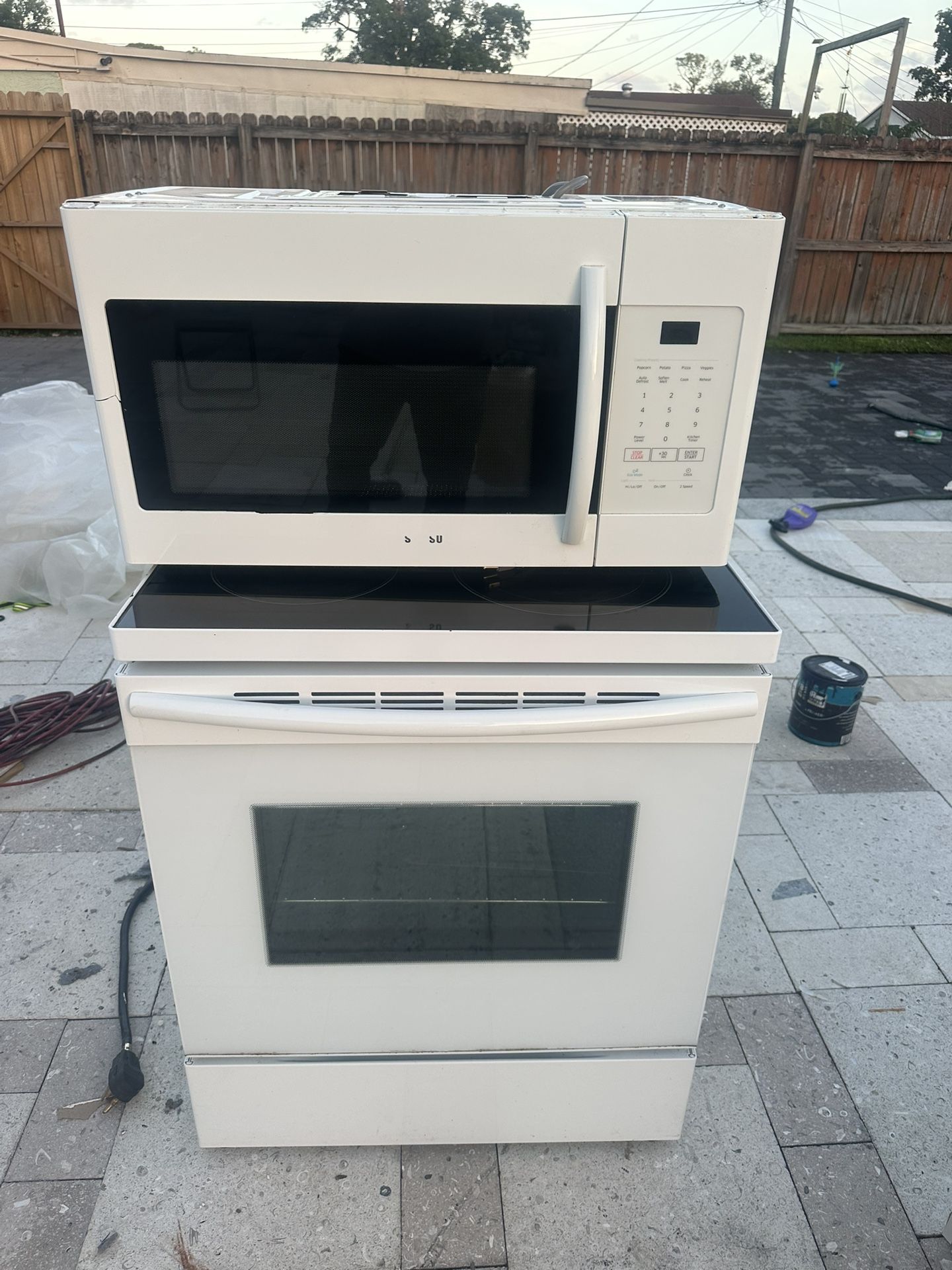 Used white kitchen stove and microwave set in good condition. Works well. Samsung brand letters missing on microwave. Oven used once.