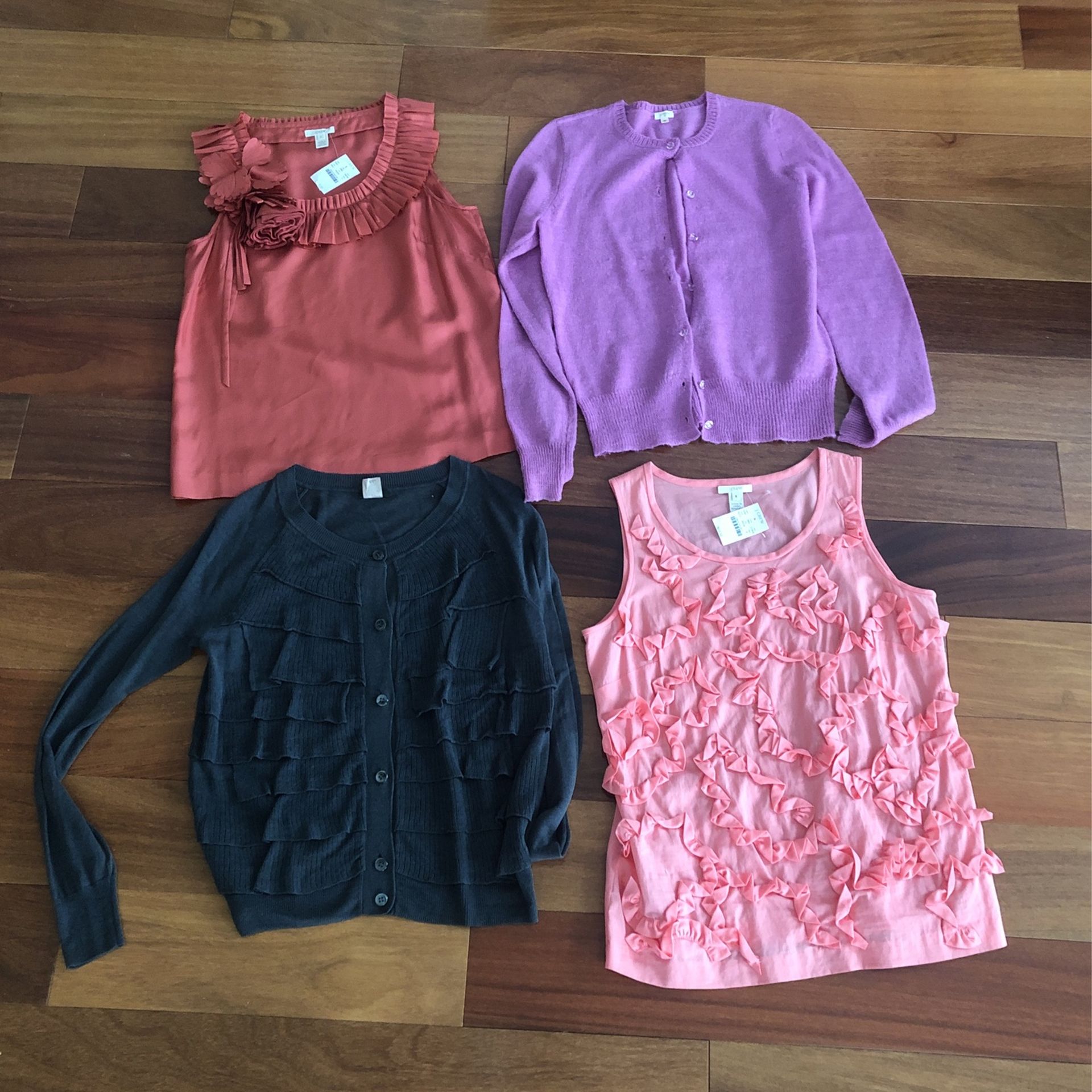 Brand new J Crew tanks with tags, Beautiful silk tank with decorative silk scalloped neck Brand new with tags, cotton fun decorative tank Two beautiful J.Crew medium cardigans. One with decorative glass buttons the other with pleats Make an offer!