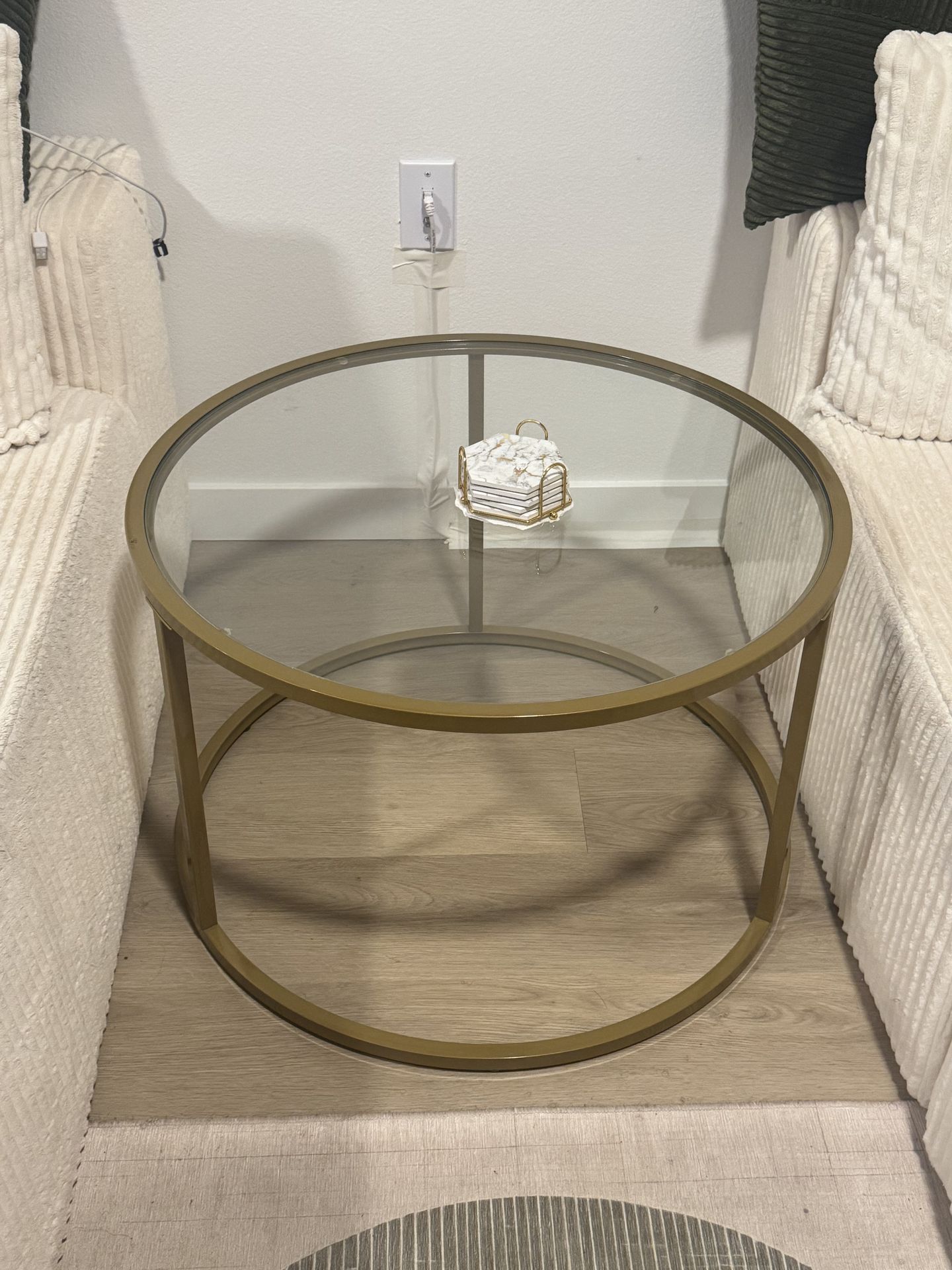 Small glass coffee table (round), modern and simple. Gold frame for living room or home office Tempered glass top for durability and elegance. 27.6 x 27.6 x 17.7 inches. Available for pick up March 6th.