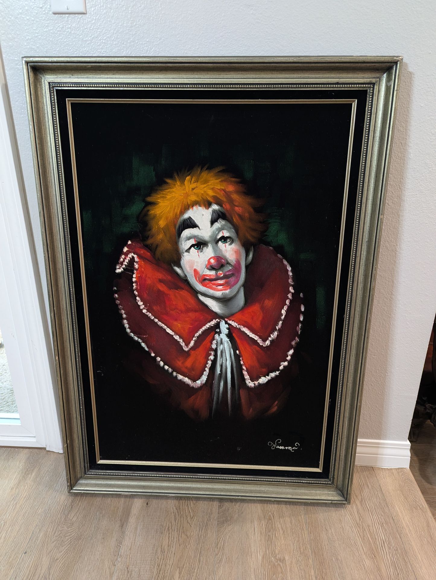 Vintage Large 42"x 30" Clown Oil Painting on Black Velvet Signed by an Artist Rare Collectible Framed Circus Clown Art. Good condition. Hard to find same. I am not familiar with the Artist, can't recognize by the signature ( would appreciate any information if know). Typically oil on black Velvet, a popular decorative style in the 60s & 70s.