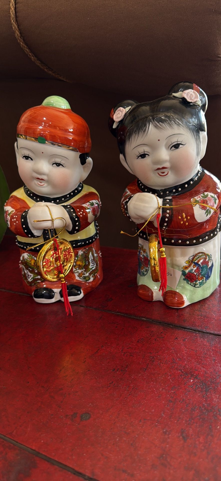Vintage Chinese Golden BOY & JADE GIRL Lucky Children Figurines 8” W/gold Coins