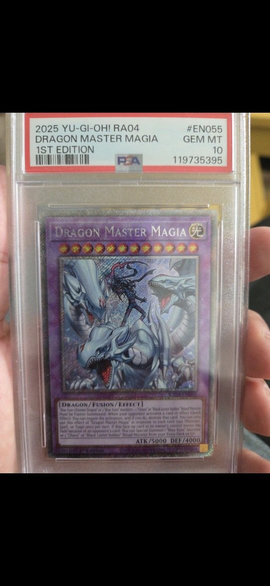 Dragon Master Magia (PUR) RA04-EN055 1st Edition psa 10 The product is a Yu-Gi-Oh! TCG collectible card featuring the "Dragon Master Magia" card from the Quarter Century Stampede set. This 1st Edition card is a Prismatic Collector's Rare with a Light attribute and a high Attack/Power and Defense/Toughness of 5000 and 4000 respectively. Manufactured by Konami, the card is in English language and falls under the Effect and Fusion card types. As a powerful Dragon-type card, it is a valuable addition to any collector's deck. $120 firm