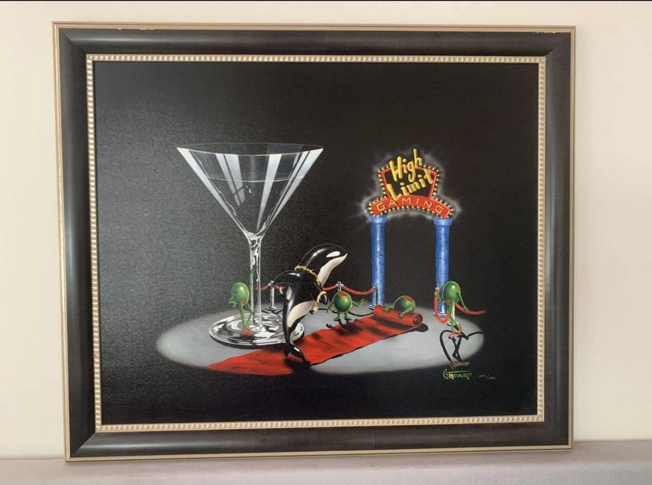 An earlier work of famous Vegas Artist Michael Godard. Offered by original owner. ARTIST: MICHAEL GODARD TITLE: THE WHALE MEDIUM: GICLEE ON CANVAS SIZE: 28" x 35" - COMES BEAUTIFULLY FRAMED EDITION: # 129 of 150 Original receipts and provenance. Offered online: $1500 (google it!) - My price: $1000 Perfect for: * Collector /Home * Home or Commercial Bar * Home Entertainment or Game Room * Man Cave * Realtor looking to stage a home for sale * Pool Enthusiast * Martini Lover * Gambling/Slot Machine/Vegas Lover CASH, VENMO or PAYPAL. PICK UP ONLY - EDMONDS AREA. ALL SALES ARE FINAL