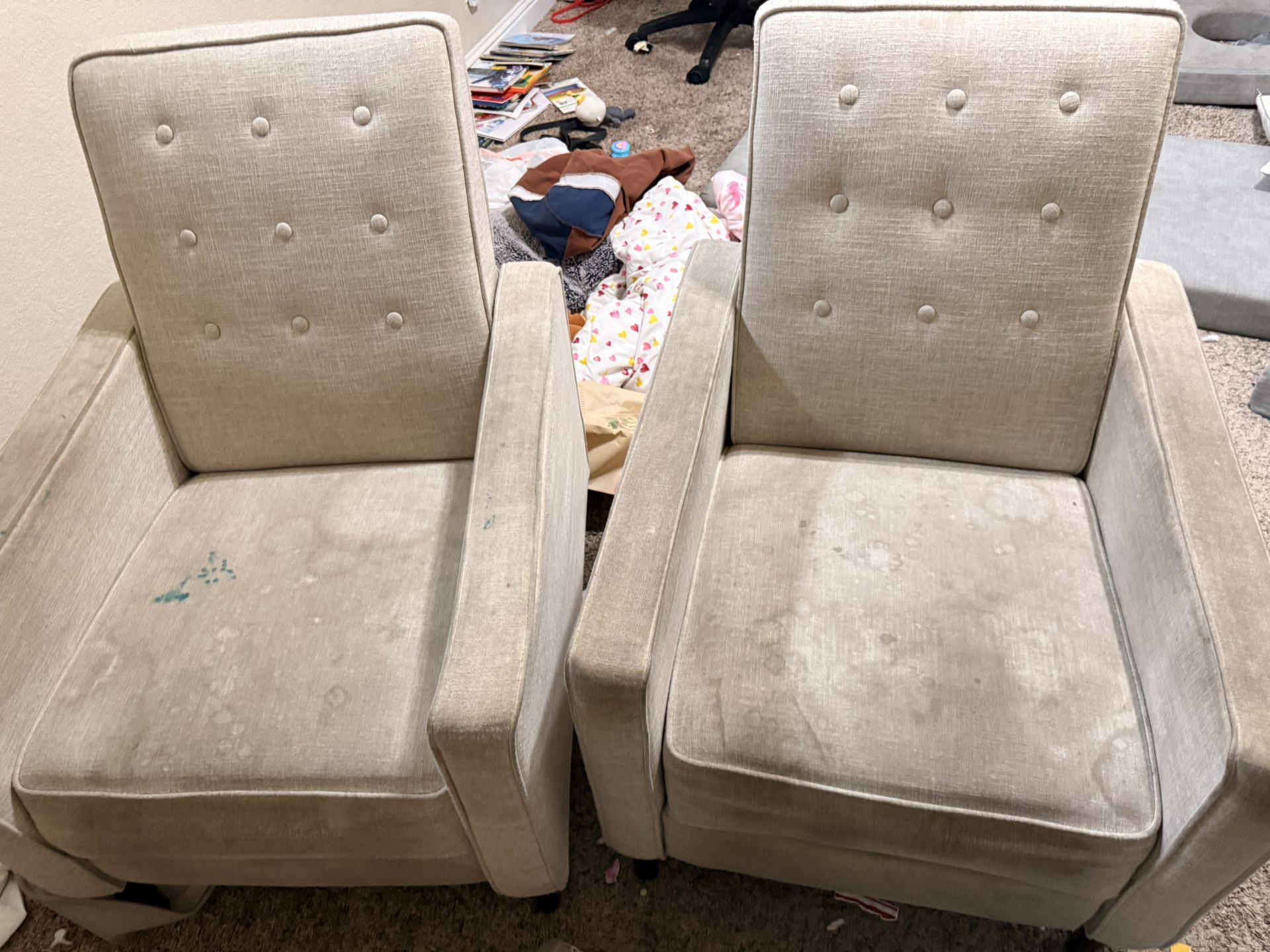 Dirty. But no pet dander or waste just food stains. Both recline.