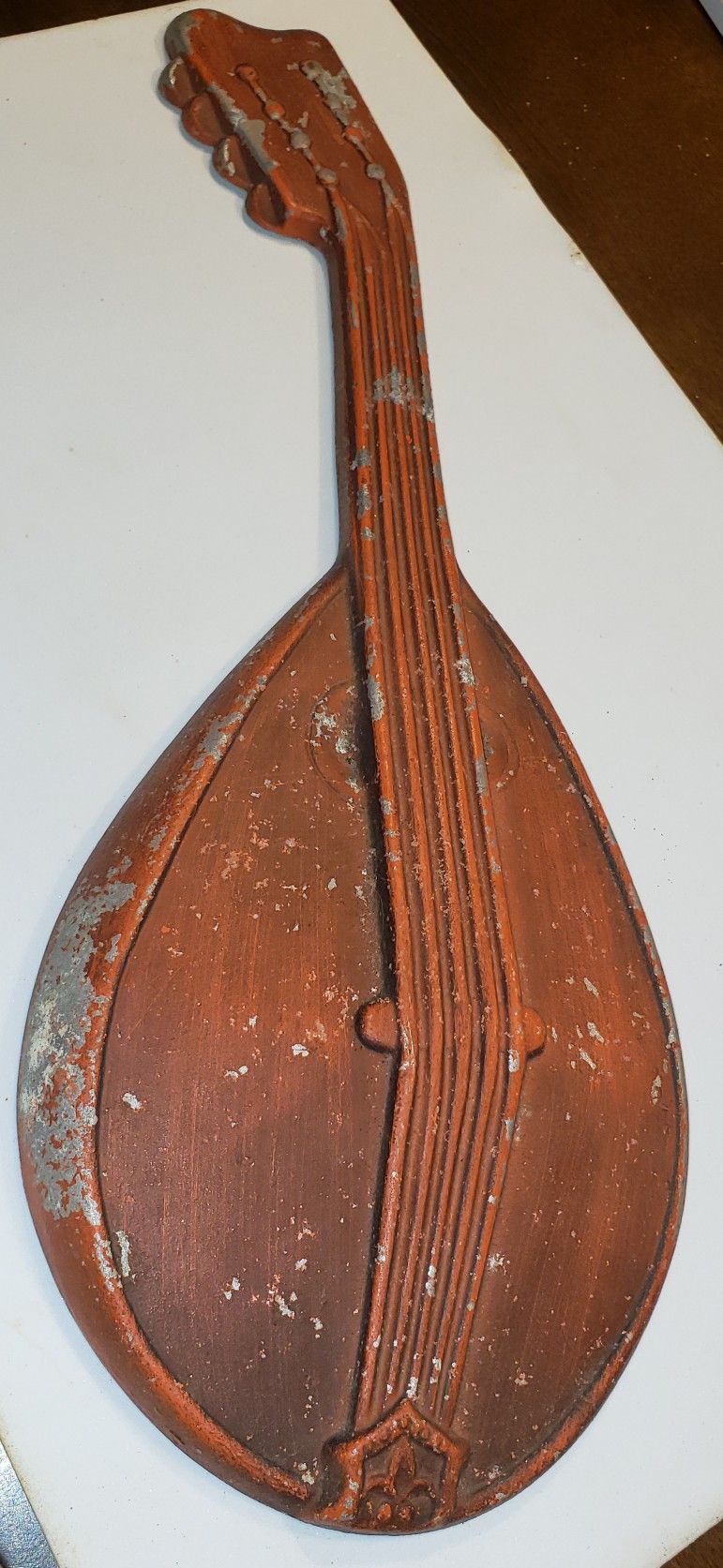 Vintage 1950s/60s wall art hanging. Royal brand. Musical instrument mandolin. Cast metal that is painted orange. Has some light scratching in the paint as shown. Otherwise very good. MCM mid-century modern retro.