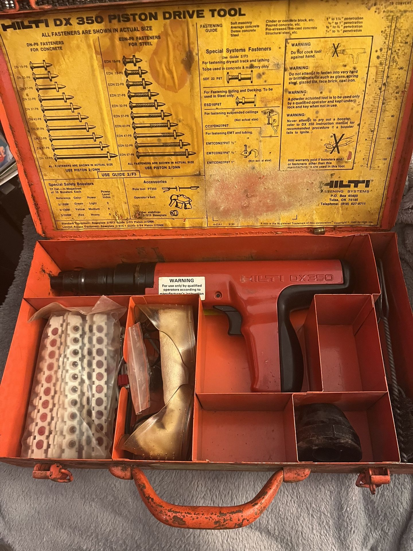 Hilti DX 350 Fastening System with Case - Piston Drive Tool for Concrete/Steel * Description: This is a used Hilti DX 350 powder-actuated tool. The kit comes with the original metal case, various fasteners (as shown in the pictures), and a cleaning kit. This powerful tool is designed for attaching materials to concrete and steel. The case has some cosmetic wear, but the tool is in good working condition. Please see pictures for details on the included accessories and condition