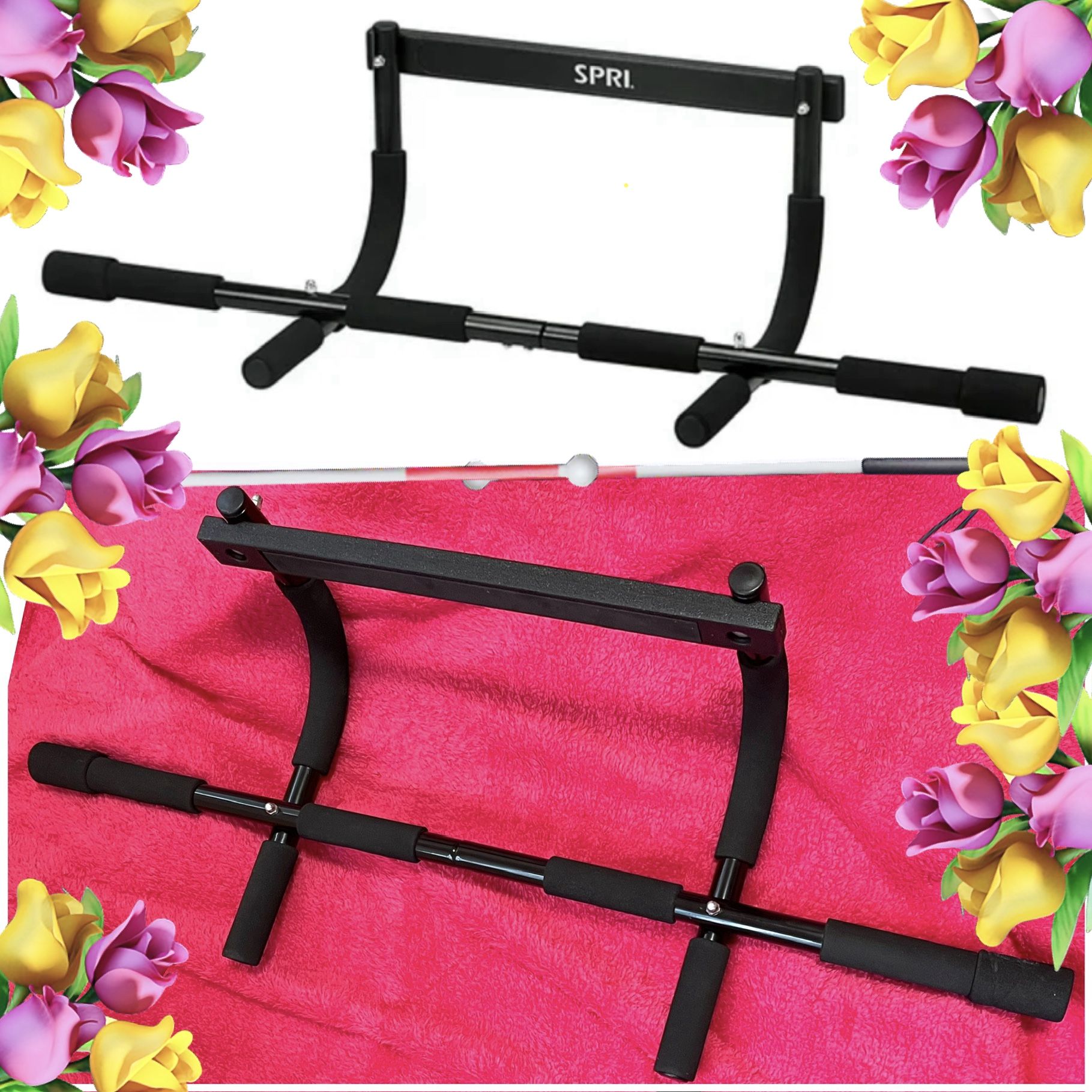 PL SPRI Black Doorframe Pull-Up Bar • Ideal for home workouts • Pre-loved condition. • ⚠️ Imperfections ⚠️: The foam on the handles (the part that goes against the door frame) began to crack open, but I sealed it with superglue (that claims to hold up to 1000lb) —-> Please see marked pictures —- Due to use of glue, the spot where the crack is may be a bit rough (it will go against the frame anyways) 💕 You can use fabric or another foam to wrap around it if it bothers you 💕 Bundle & save 🤗