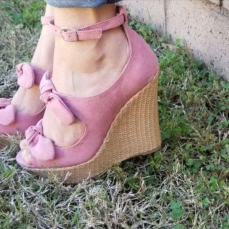 Last pair 10 PRICE FIRM NO HOLDS TRUE TO SIZE NO TRADES SUEDE BOW ANKLE STRAP WEDGE This comfy platform wedge features a peep toe silhouette, cutout vamp with double bow accent, and basket weave platform wedge heel. Finished with a lightly padded insole and adjustable buckled ankle strap. Material: Vegan Suede (man-made) Sole: Rubber Measurement Heel Height: 4.5" w/ 1.45" Platform (approx