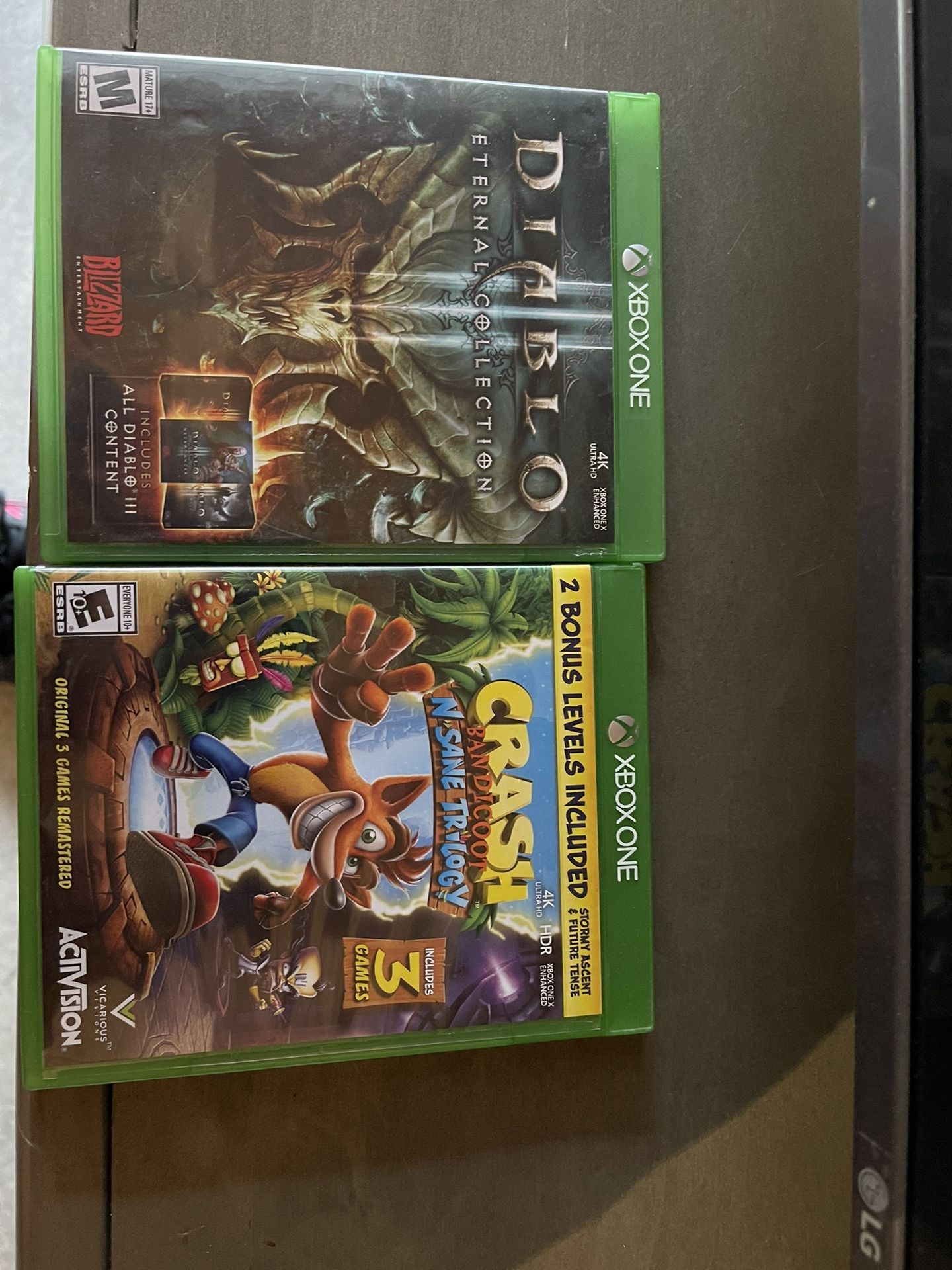 XBOX ONE GAMES. I have Crash Bandicoot N- Sane Trilogy. It’s 3 games in one disc. Then I have Diablo External Collection. Both are great games. I sold the XBOX so need to hang on to the games! Would make great gifts