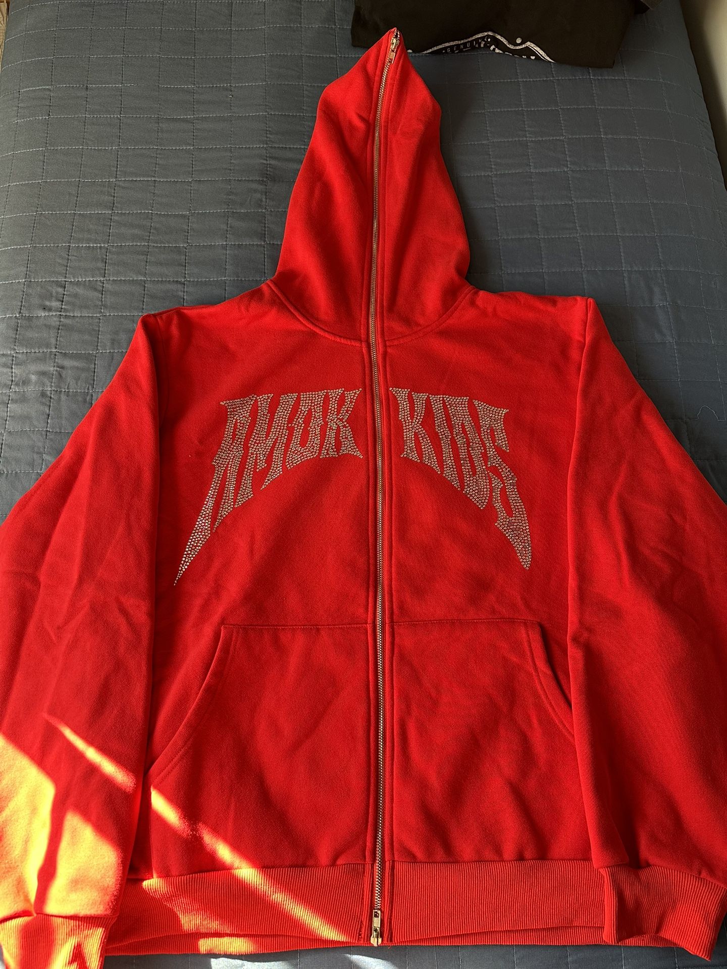 AmokKidz Red Rhinestone Full Zip Sweater Never worn just washed Size XXL fits XL $25