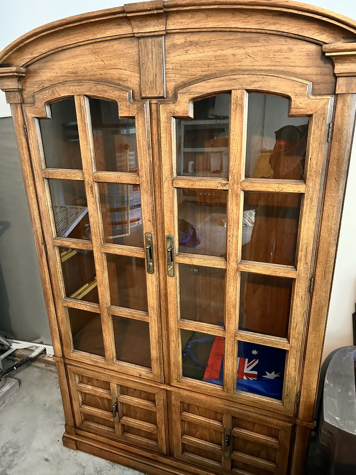 $400 Or best offer Thomisville made glass pane doors that open up to removable glass shelving, also having light switches inside on the top shining down, with 2 storage doors on the bottom that also have 2 drawers.