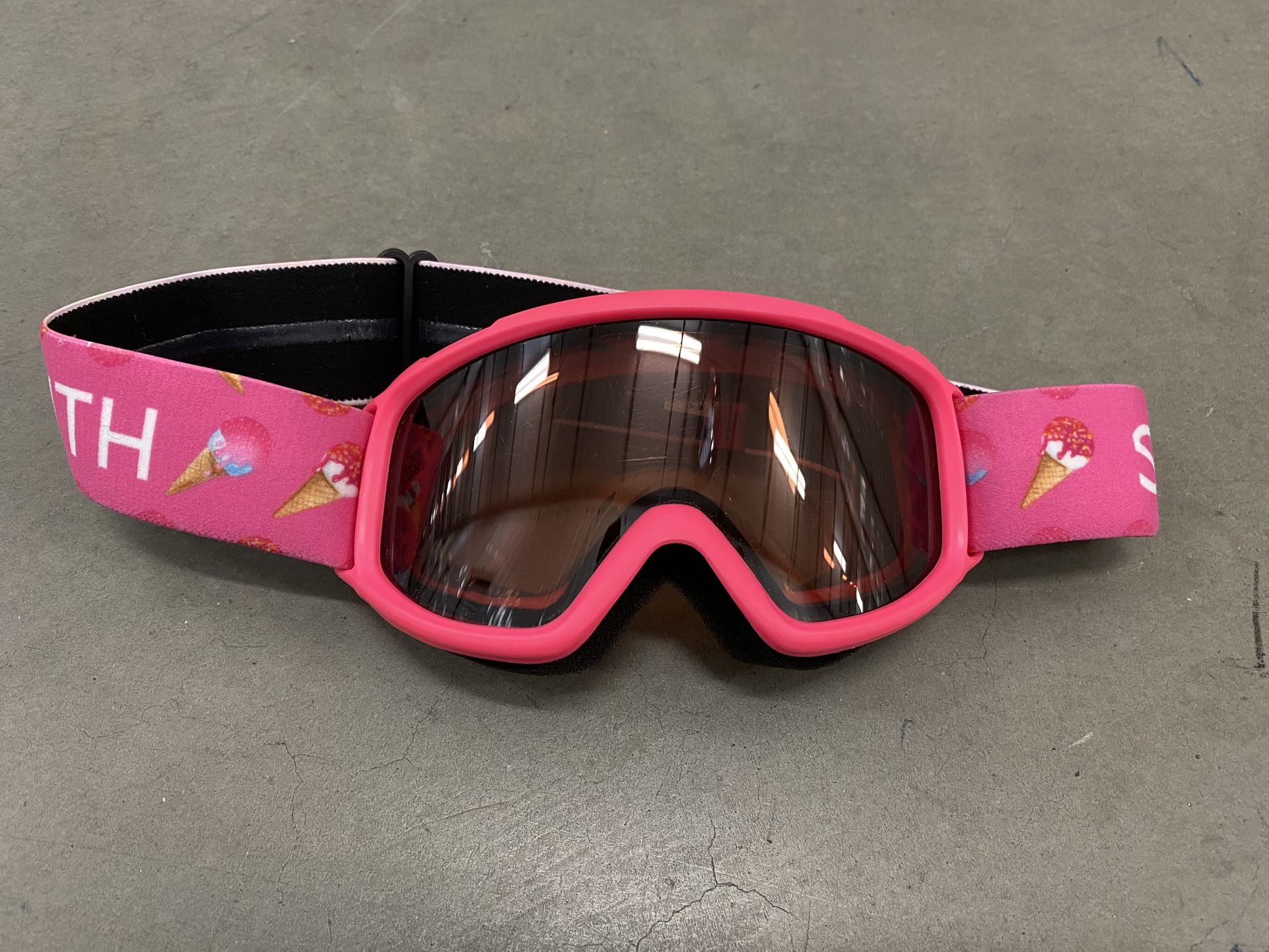 Preowned. Gently used. Small scratches on lens. Youth ski snowboard goggles. Pink strap with ice cream cones. Good condition.