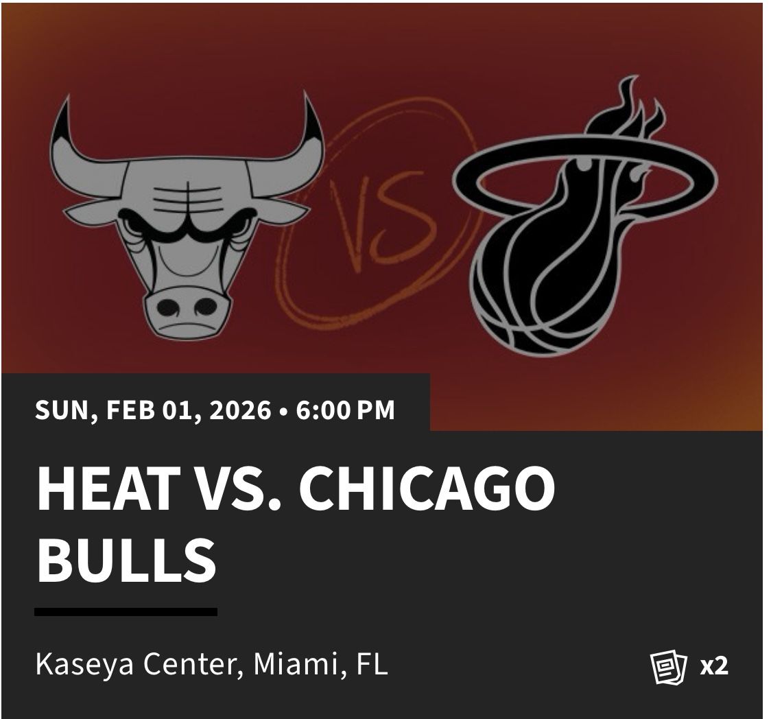 Miami Heat v Chicago Bulls. Sunday, February 1 at 6 o’clock. Amazing seats by the Heat bench. Section 110/111, row 15, seats 5/6 with extra big plushy seats. Includes parking at Bayside. $125 per seat and parking. Best deal in town!!