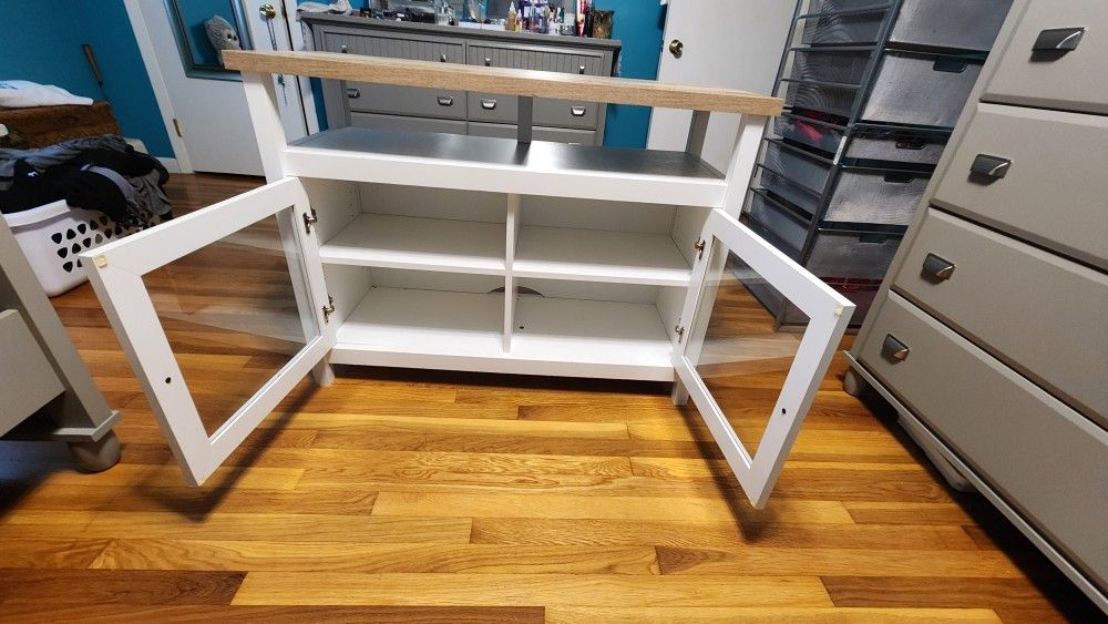 This is a solid wood TV stand it's very heavy and I paid $600 for it brand new it's used it has two glass storage apartments on the bottom
