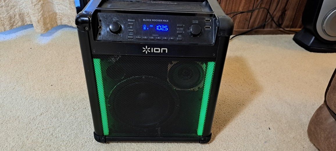 Works great with main power connection. Maybe it needs a 12V rechageanle battery. highlights Brand Ion Speaker Maximum Output Power100 Watts Connectivity TechnologyBluetooth, Auxiliary, USB, NFC Audio Output ModeStereo Mounting TypePlug Mount Model Name Block Rocker Max 100 watts of dynamic power will energize your parties, cookouts, and more. Light bars offer a full range of color options. Light Mode Switch lets you control the light show. Powerful 8-inch woofer and wide-dispersion tweeter deliver vibrant sound. 100-foot Bluetooth range.USB powerbank with 2 USB ports (5V, 1A ea.). AM/FM radio with 12 presets. 1/8-inch (3.5mm) aux input for non-Bluetooth devices. Bright, legible LED display clearly shows all functions and system status. Rugged design with rubber corners. Retractable handle and wheels. Wired link output for connecting additional speakers. With NFC Easy Pair*