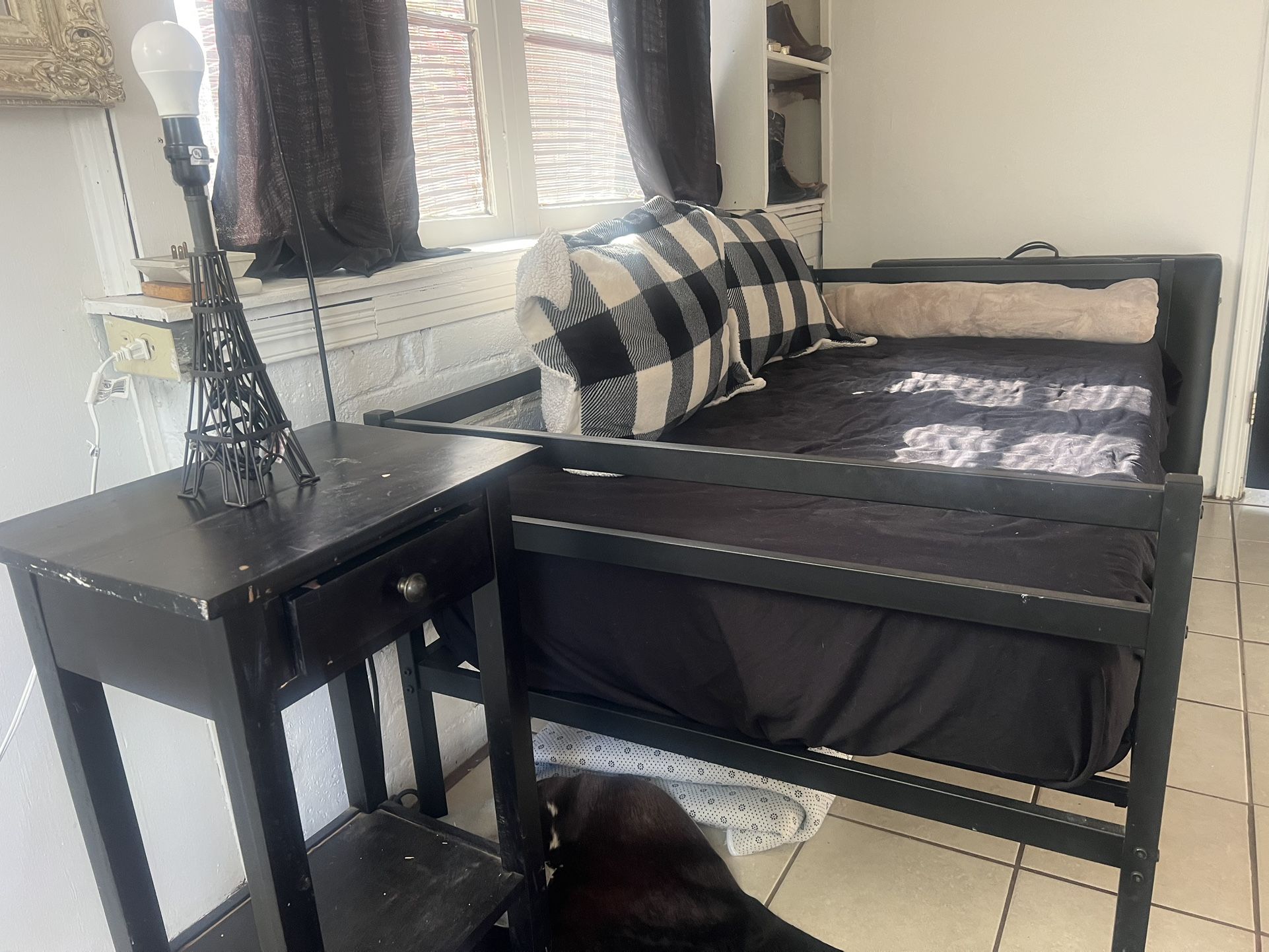 Metal twin day bed & night stand. I’m tossing the mattress but you can have it if you want it.