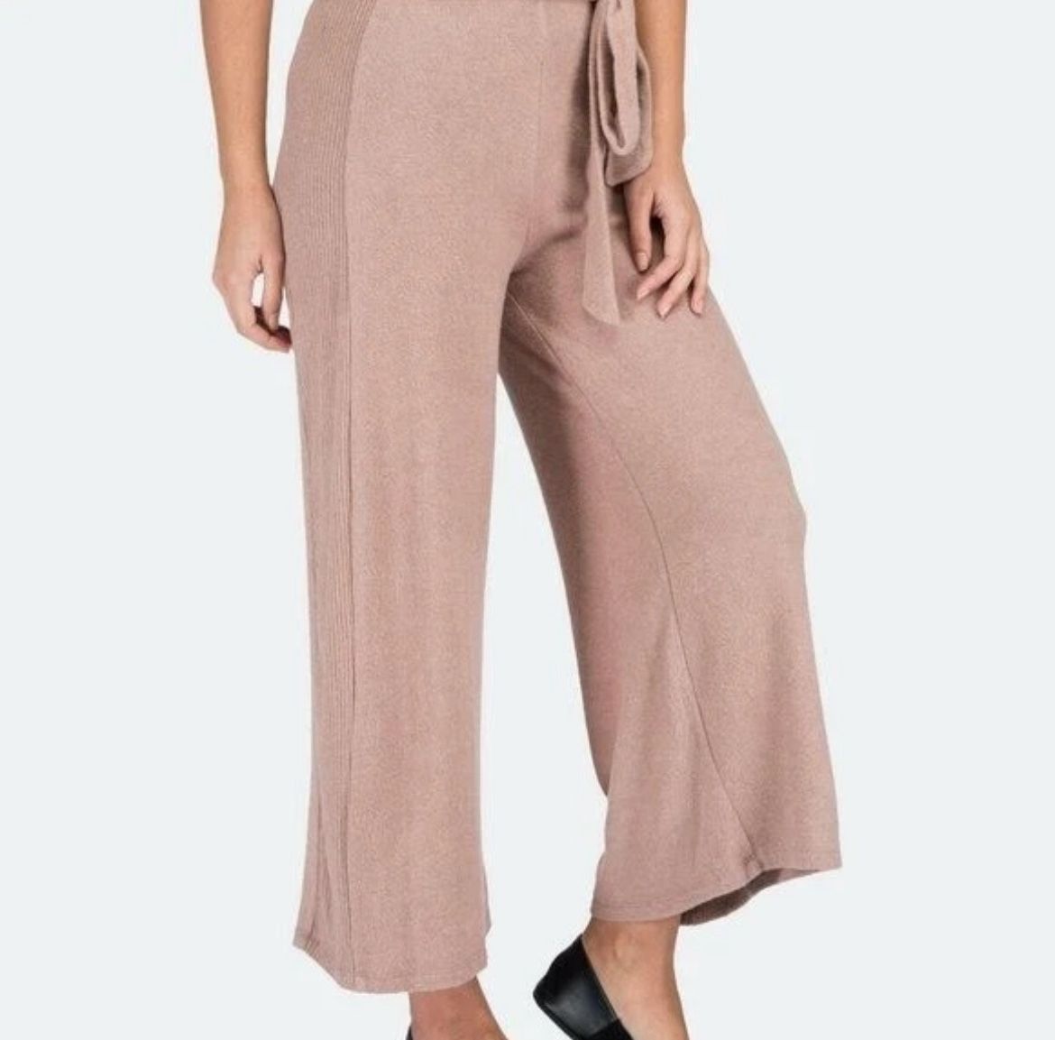 A stretchy ribbed knit and cropped, wide-leg silhouette make these lounge pants chic enough to wear from the bed straight to brunch. The Doris pant never felt cozier! We've updated you're favorite wide leg pant. 75% Rayon, 21% Polyester, 4% Spandex Hand Wash Cold. Do Not Bleach. Lay Flat Dry. Imported. Cropped length, Elastic waistline, Wide leg, Fits true to size. Size XS: Inseam: XS 23.1/2", Waist: XS 26 Size Small: Inseam: S 24-1/2" Waist: S 28"