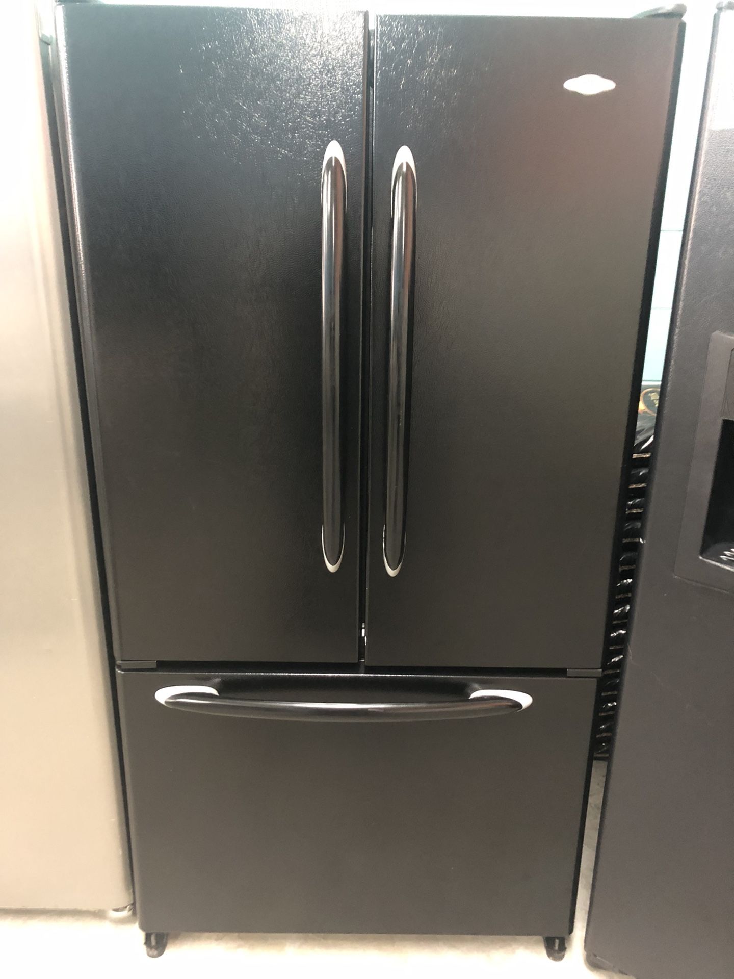 Maytag 25 cubic foot black french door refrigerator, 36” wide 69” high 32” deep. Food section has adjustable split spill proof glass shelves 2 humidity controlled crispers full width deli draw and adjustable door bins. Freezer is a pull out draw with 2 fully extendable baskets. Comes with 120 day warranty. Financing and delivery available.