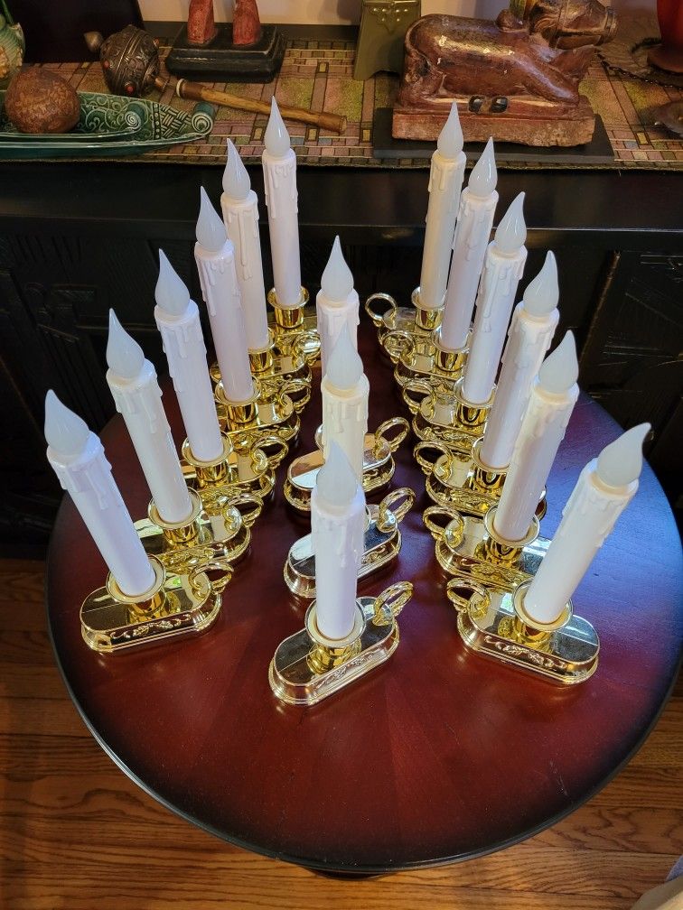 Set of 15 LED Candles with plastic Brass finish base. Each candle requires 2 X AA batteries not included When batteries are inserted and cable base is re-attached (screwed in) the candle will flicker amber for approximately 6hrs and then automatically shut off and turn back on at the same time each day Originally $13 each candle selling all 15 for $70