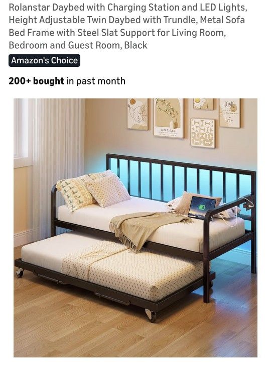 Metal framed day bed with trundle. The trundle has legs that lift it to make it a full size bed. MATTRESS IS NOT INCLUDED. I posted pics with the mattress so anyone interested could see how it looks but it's NOT included. The LED lights all work but they're not as bright as they look in the Amazon pics but they are brighter at night.... obviously. It's barely been used. I think my mom took one nap on it. Except for that and cats napping, it's never been slept on. Must be able to pick up and have help though it is pretty light. Listed for $145 on Amazon.
