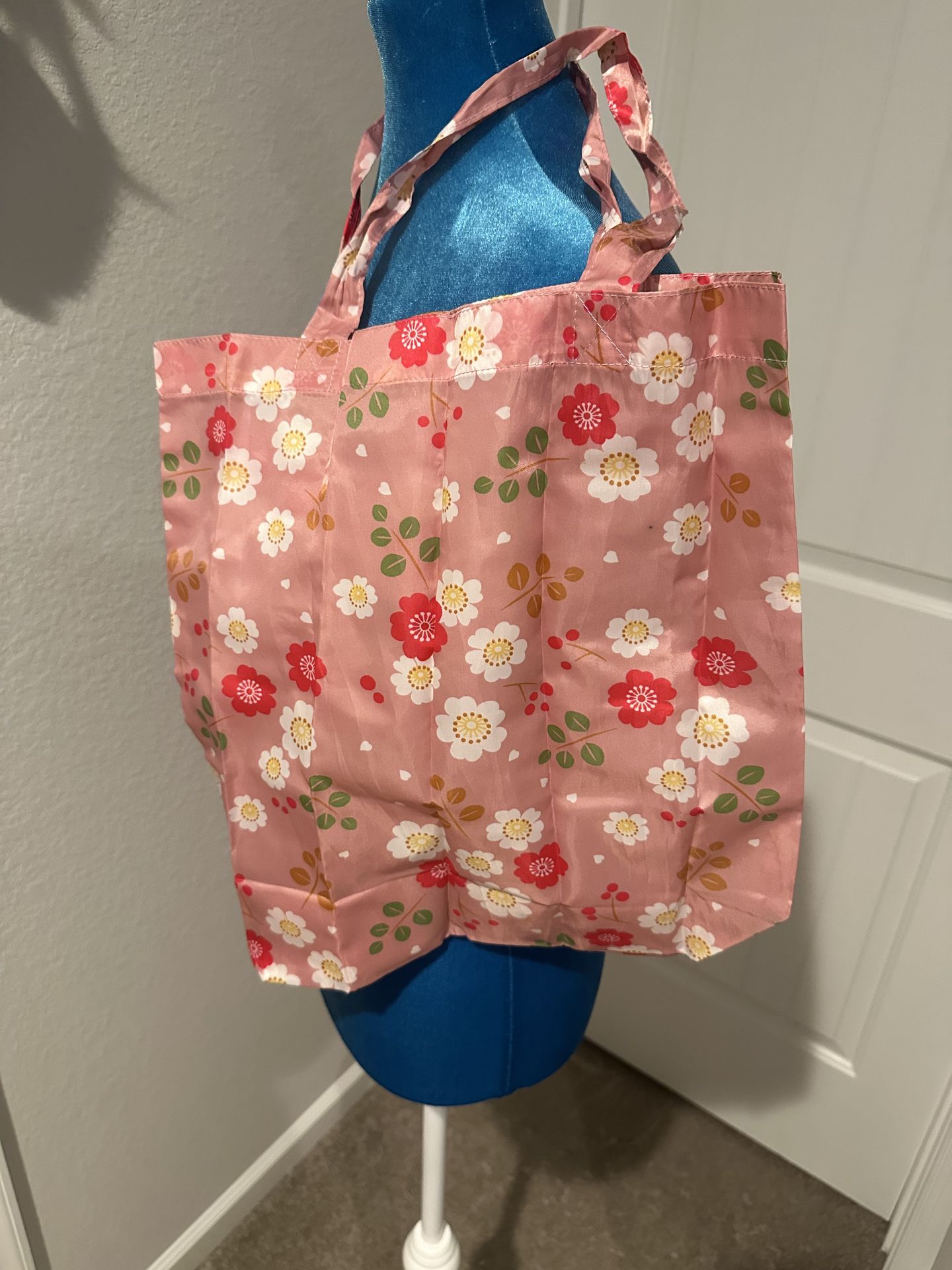 Cute and practical reusable tote bag in a soft pink color with an all-over floral print (white/red flowers with green leaves). Lightweight but roomy—great for groceries, errands, gifting, library trips, or keeping in your car as an extra bag. Details: Reusable tote / shopping bag style Pink floral pattern Open-top design with sturdy carry handles Folds down easily for storage Condition: Pre-owned; overall good shape with normal light wear from storage/use.