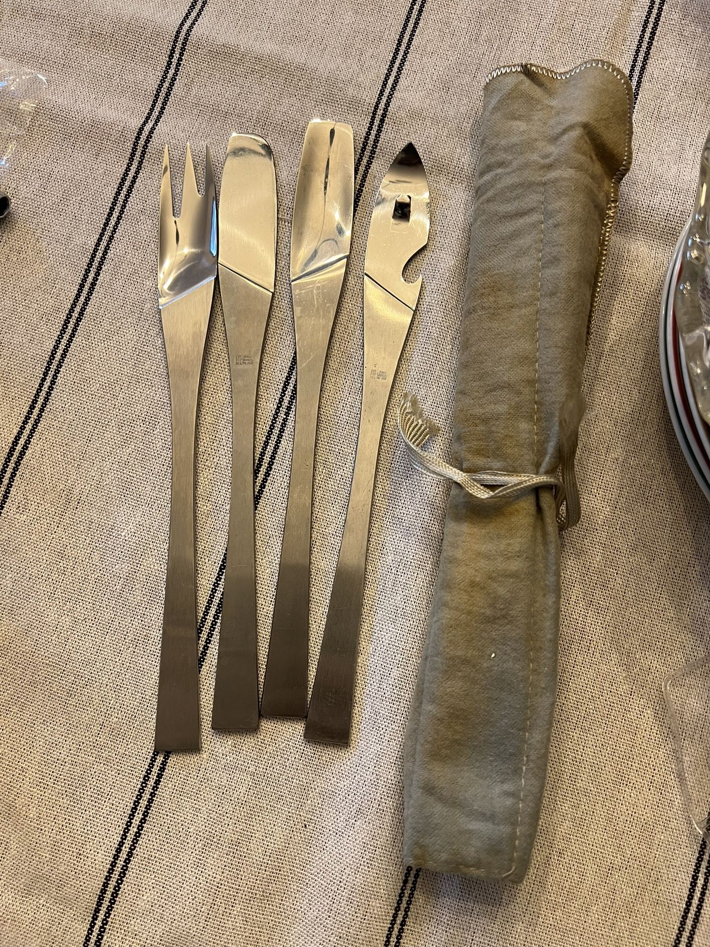 Modern Stainless Steel Cheese Knife Set – 4 Pieces with Roll-Up Storage Pouch Elevate your cheese board with this sleek, modern stainless steel cheese knife set. This 4-piece set includes: • Pronged Fork – Ideal for picking up slices of cheese or cured meats. • Spreader Knife – Perfect for soft cheeses like Brie or goat cheese. • Flat Chisel Knife – Great for semi-hard to hard cheeses like cheddar or gouda. • Parmesan Knife with Bottle Opener Tip – Excellent for breaking into hard cheeses and opening a bottle of wine or beer. Comes with a soft, fabric roll-up pouch for stylish storage or transport.