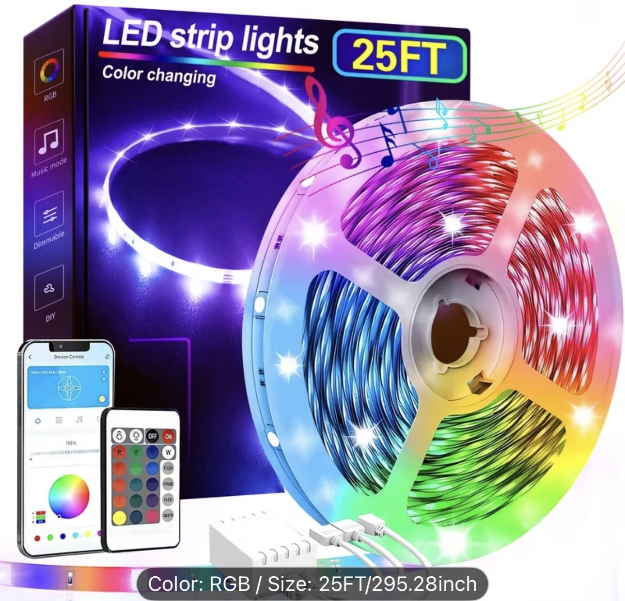 25FT Extra Long Smart Led Strip Lights, RGB LED Lights With App And Remote Control, Dimming, Timing, DIY length and 16 million colors, Music Sync Color Changing Lights For Room Party, Halloween, Thanksgiving Gifts, Christmas, Home, Stage Decor