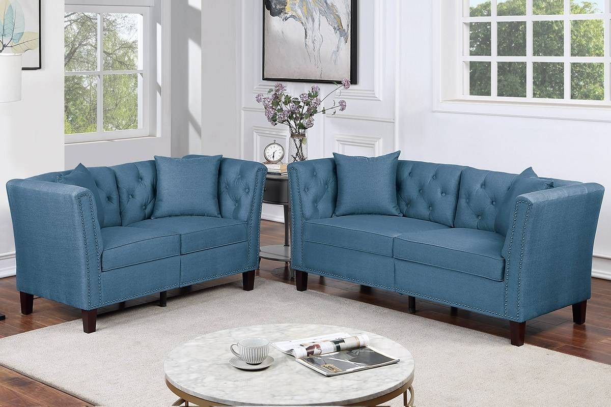 BRAND NEW 2 PCS SOFA SET 4 ACCENT PILLOWS INCLUDED LOVESEAT 55" × 30" × 31" H SOFA 70" × 30" × 31" H BLUE COLOR GLOSSY POLYFIBER MATERIAL NEW IN BOXES ASSEMBLY REQUIRED PX8866 PRICE $659