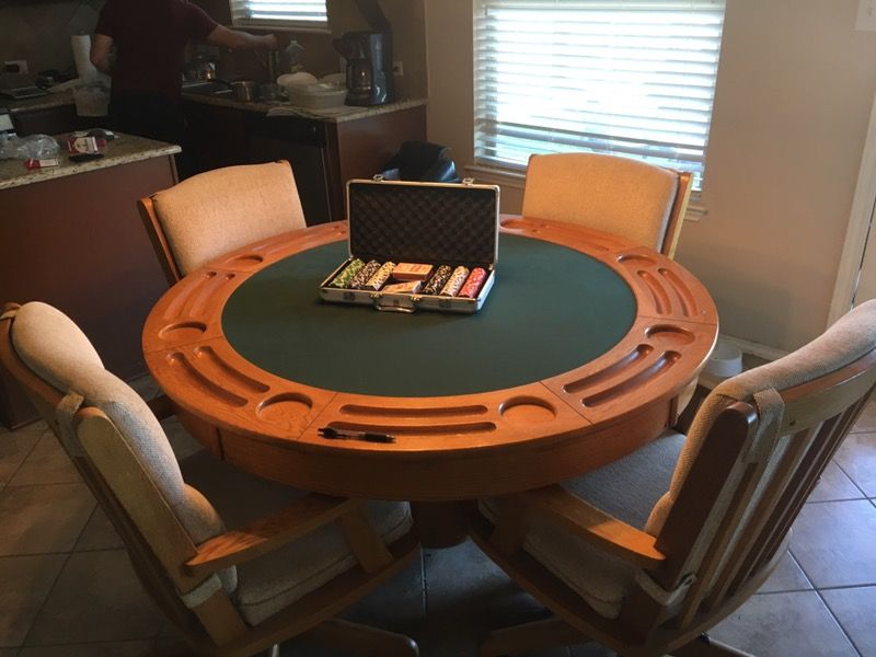 This poker table / dining room table is in excellent condition. Made of strong oak and both chairs and table are in excellent condition.