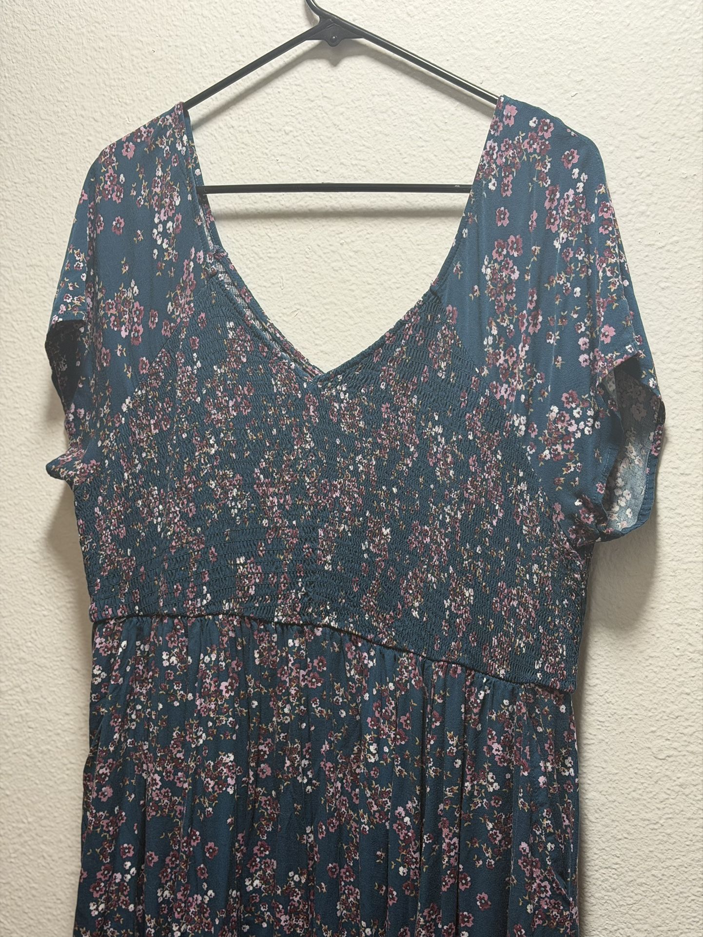 Beautiful blue floral dress with pink flowers. Features a V-neck, short flowy sleeves, and a stretchy smocked top for a comfortable fit. Lightweight and perfect for summer or casual wear. Good condition