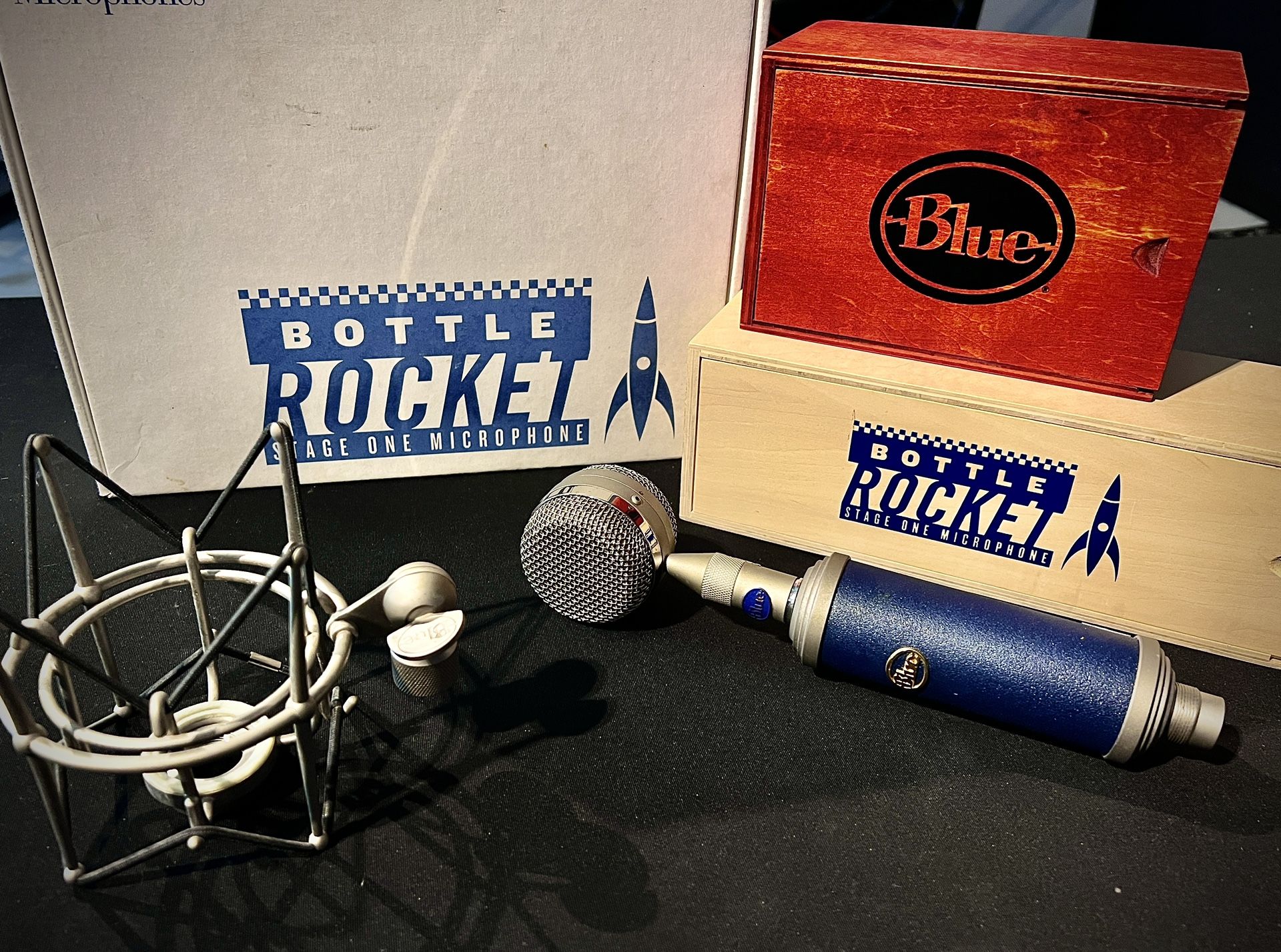 I have perfect condition Blue Bottle Rocket condenser microphone body, with the B6 cap. The Bottle Rocket is part of Blue Microphones top of the line flagship microphones, do not confuse this with the Blue Bottle, or the Baby Bottle which is the little brothers. I originally bought the B6 Bottle rocket because of its similarities to the Neumann TLM103 which I used for a long time, but this mic handles high end sibilants much better - the high end is just more full of life to my ear, and my recordings. The B6 is the most preferred cap for vocals - has a super clear and crisp sound, similar to the Neumann 87 - sharp with a smooth high end. It’s does an amazing job for hip hop, female, and singer songwriter tones. It actually works really well on acoustic guitars as well, but vocals is where it shines. I can hook it up for you, and allow you to hear for yourself - you’ll be able to tell instantly ! I’m only letting it go because I have 2, used for a stereo project I was doing, but Im only keeping one - so I’m letting one go. My other will never leave my collection ! No low ballers, this is a professional piece of equipment. I’m in no hurry to sell - it’s looking for the perfect studio to take over ! Comes with the Bottle Rocket body, the B6 mic cap, the Blue Shock Mount, the original hardwood boxes for the body and head, and the original packaging.