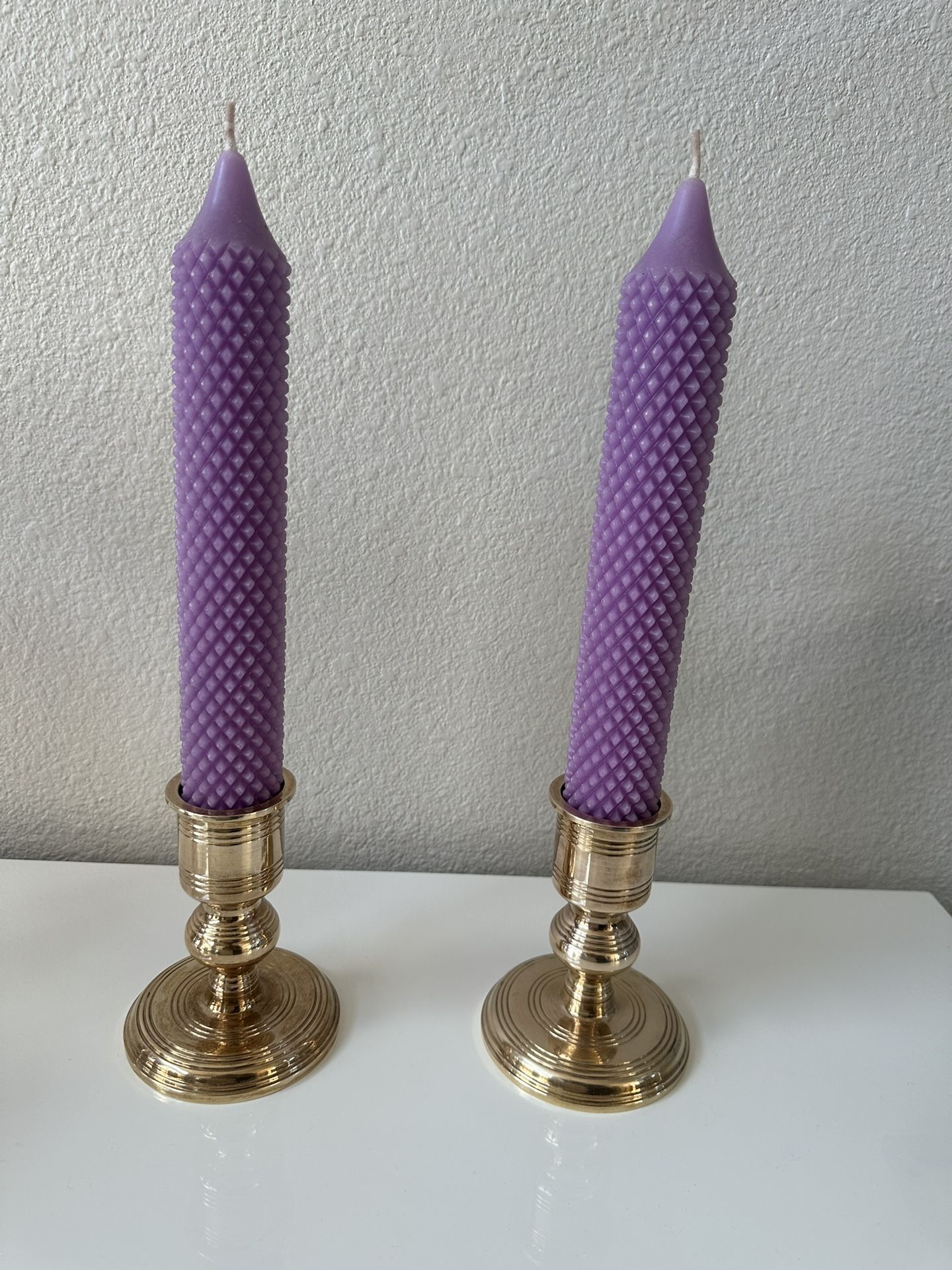 This Brass Candlestick Holder Set of 2 is perfect for adding a touch of elegance to any room in your home. Made from polished brass, these medium-sized candle holders are suitable for indoor use and all occasions. The set includes two unboxed candle holders, each weighing 2 lbs, making them easy to clean with a damp cloth. These original candle holders are ideal for furniture placement and can be used in any room to create a warm and inviting ambiance. Candlestick holders about 6” tall with candles about 18” tall