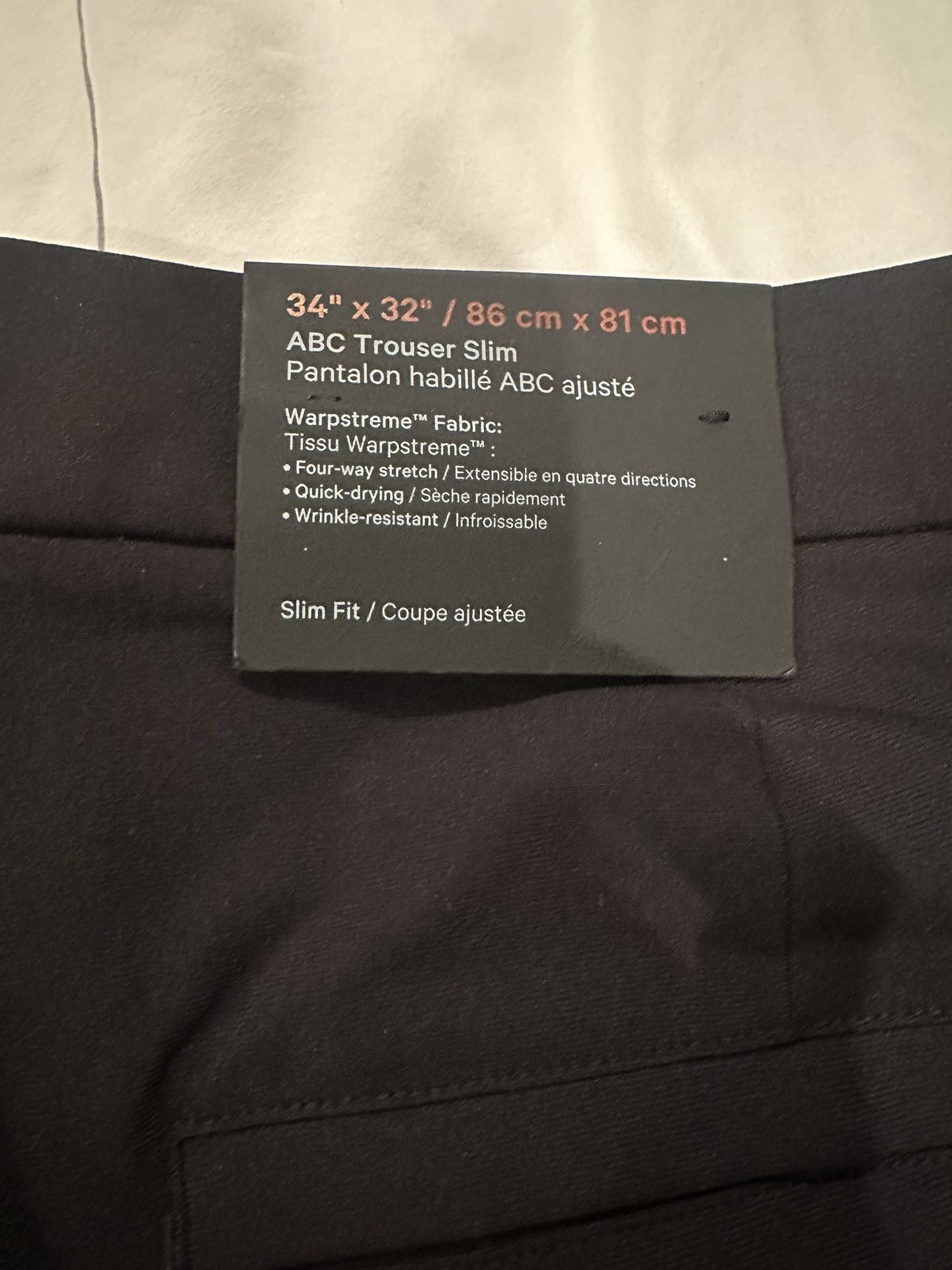 Brand new, never worn Lululemon Men’s ABC black slimfit trouser, 32”L, 34 w. My husband went on a diet and never wore them!