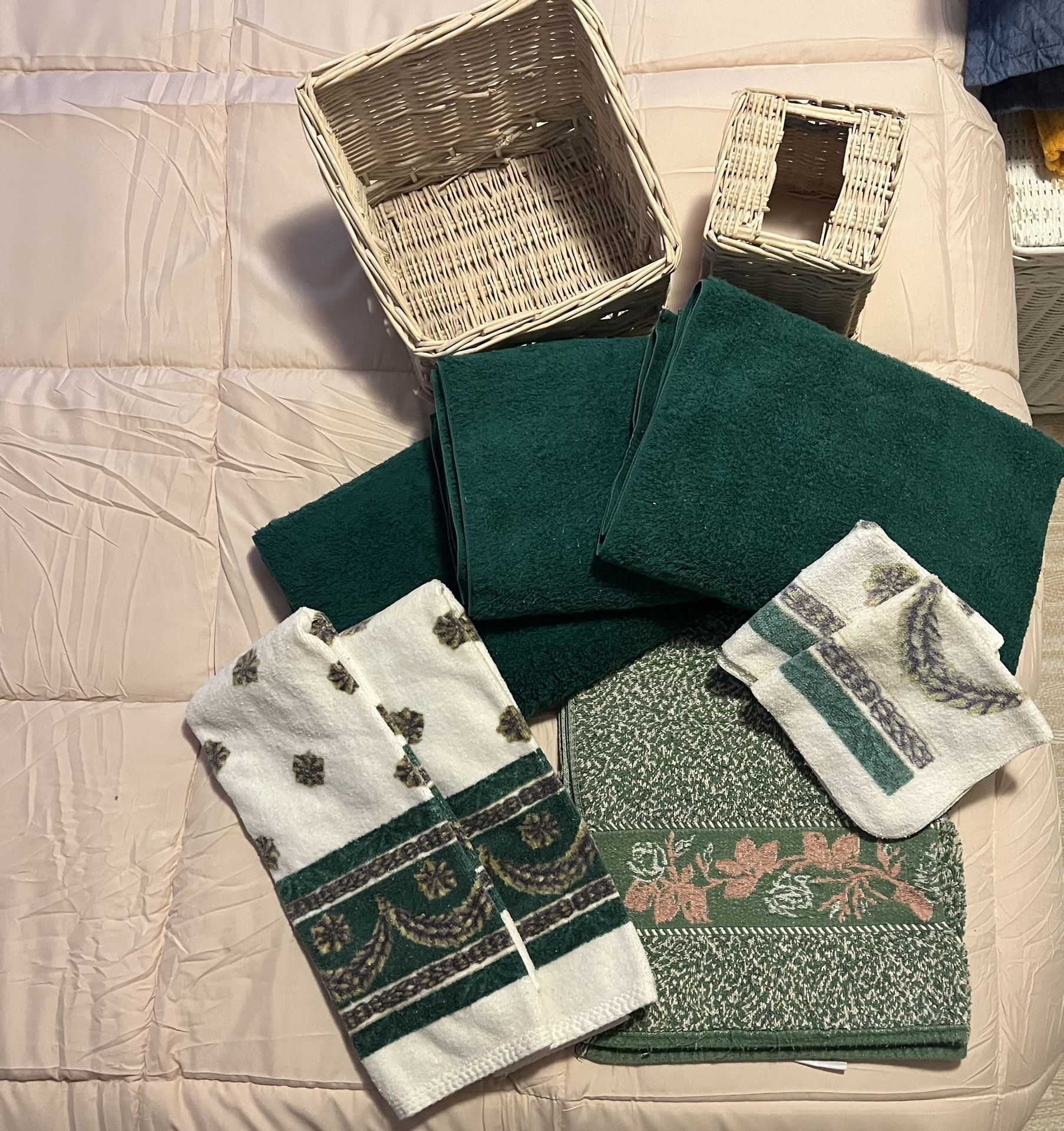 Bathroom set includes: 3 green bath towels, 1 decorative green/coral bath towel, 2 hand towels, 2 washcloths (a little faded), wicker tissue box cover and matching wicker basket. Pick up in Arbor Heights area of West Seattle.