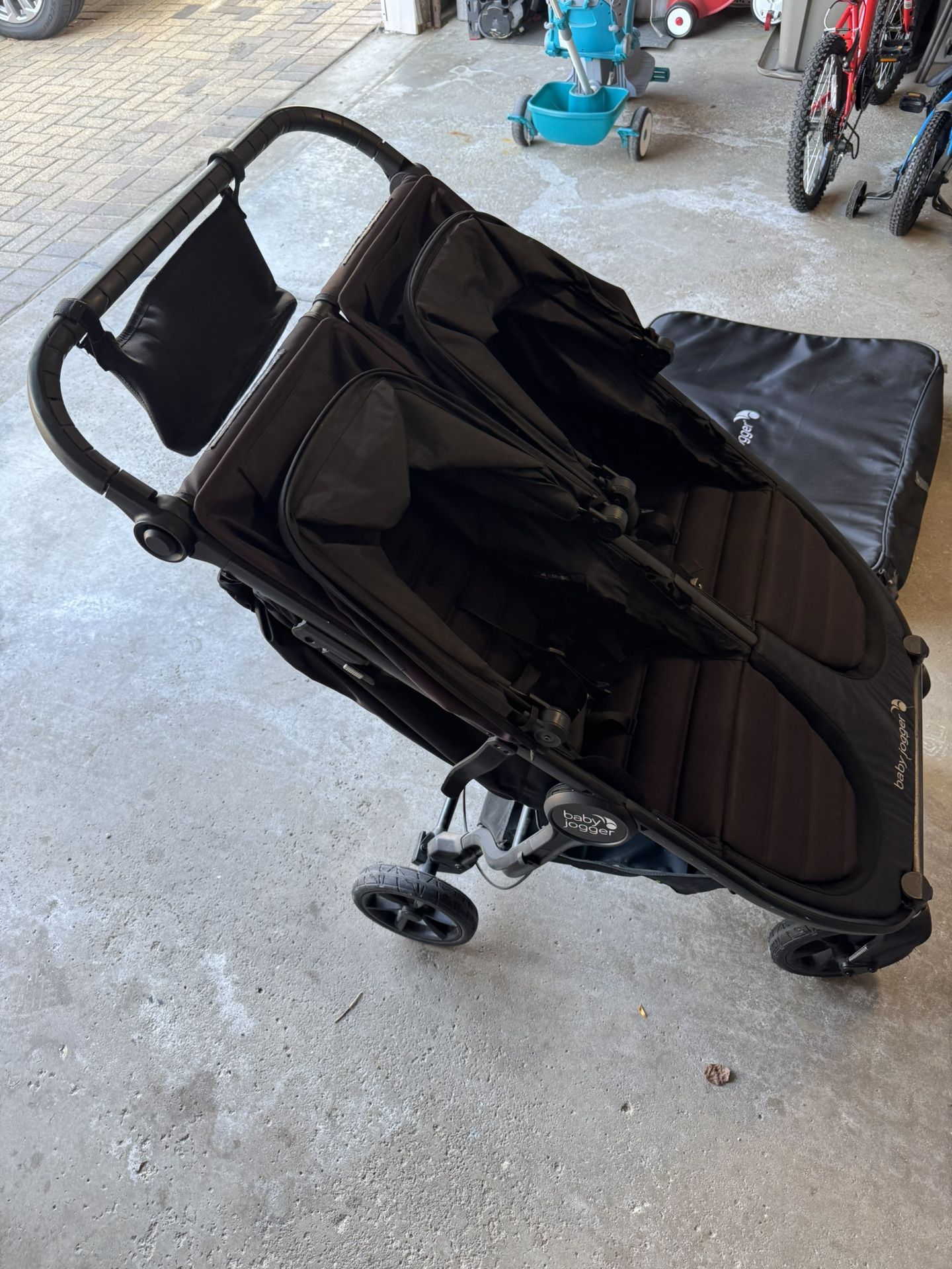 Double stroller with travel bag. Travel bag is slightly ripped in one corner