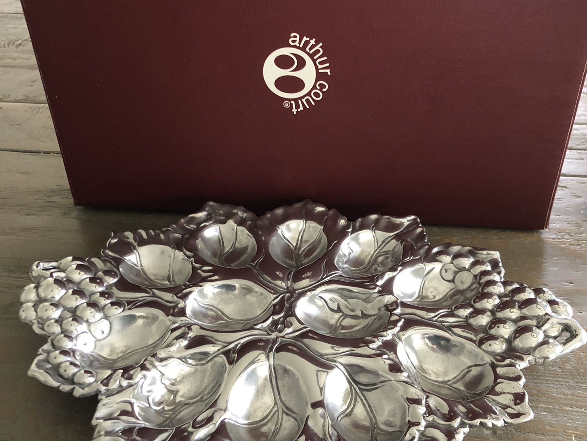 Website description: Almost everyone is tempted by deviled eggs on a buffet. Arthur Court’s Grape Deviled Egg Tray serves them with gorgeous visual appeal. Prepared eggs nestle on grape leaves, bunches of plump grapes add embellishment. Crafted in signature premium aluminum alloy, the tray holds 12 egg halves. You will be delighted with the presentation this Arthur Court deviled egg serving tray creates, with its attractive grape motif and gorgeous visual appeal. Each jagged edge of this piece resembles the tip of a leaf, while veins run in deep, intricate patterns across the entire surface. A bundle of remarkably defined grapes rest on each side of this dish, adding more appeal to this handmade, aluminum holder. Size: L: 12.5" / W: 9.0" / H: 1.0" Care: Wash by hand with mild dish soap and dry immediately - do not put in dishwasher.