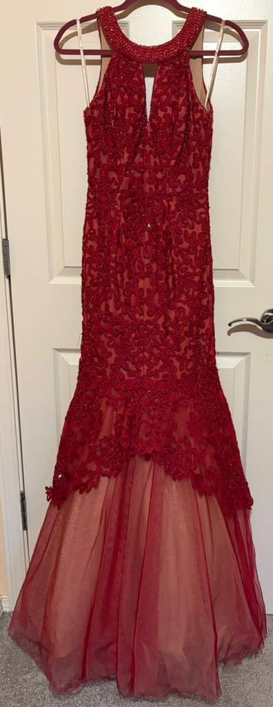 Good condition, one-time wear, dark red, long, sleeveless, mermaid dress + dark red long gloves to match it. Perfect for many celebrations!!