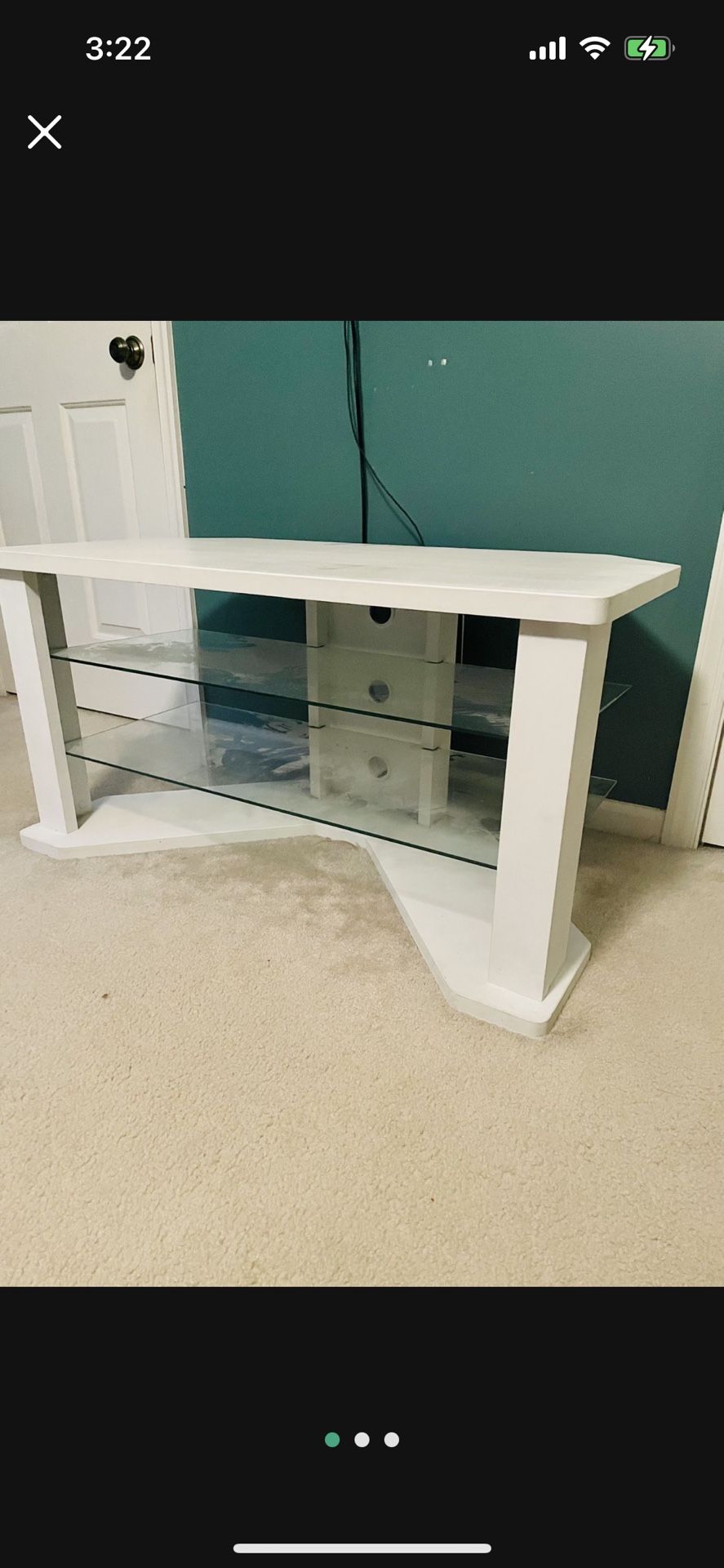 Not a flimsy quality tv stand with glass shelves. Painted white. Just pulled out of storage and will be dusted prior to pick up. Dimensions in the last picture, 42 inches wide. Glass shelves do come out
