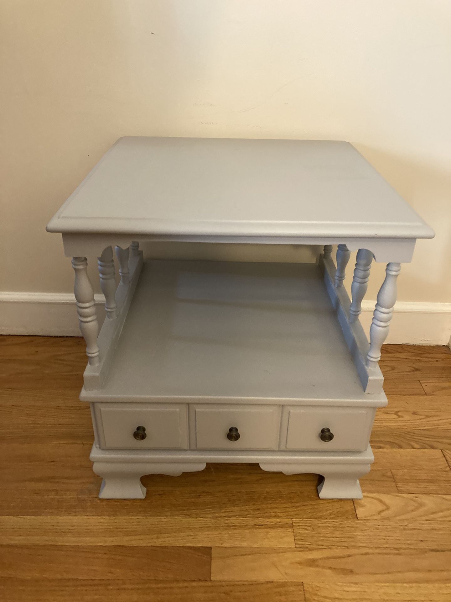 Solid wood vintage style end table Painted flat gray with black hardware Drawer works great 22 1/4” tall 20 1/2” wide 20 1/2” deep Delivery available depending on distance